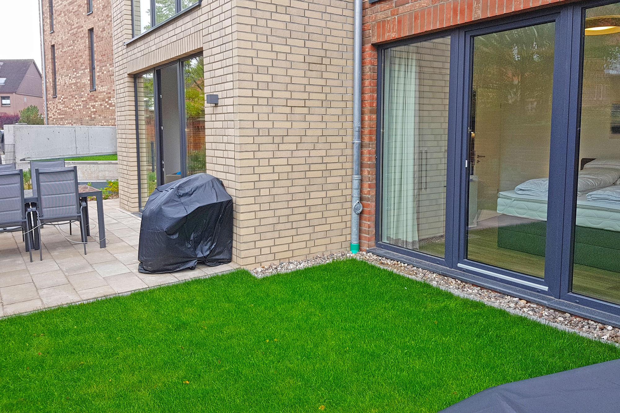 Der gemütliche Wohnbereich ist mit einer bequemen Couch, HD-TV und WLAN ausgestattet. Große, bodentiefe Fenster lassen viel Tageslicht in die Wohnung und bieten einen schönen Blick auf die möblierte Terrasse mit Grill und den nutzbaren Gartenbereich – der perfekte Ort für entspannte Stunden an der frischen Ostseeluft.
