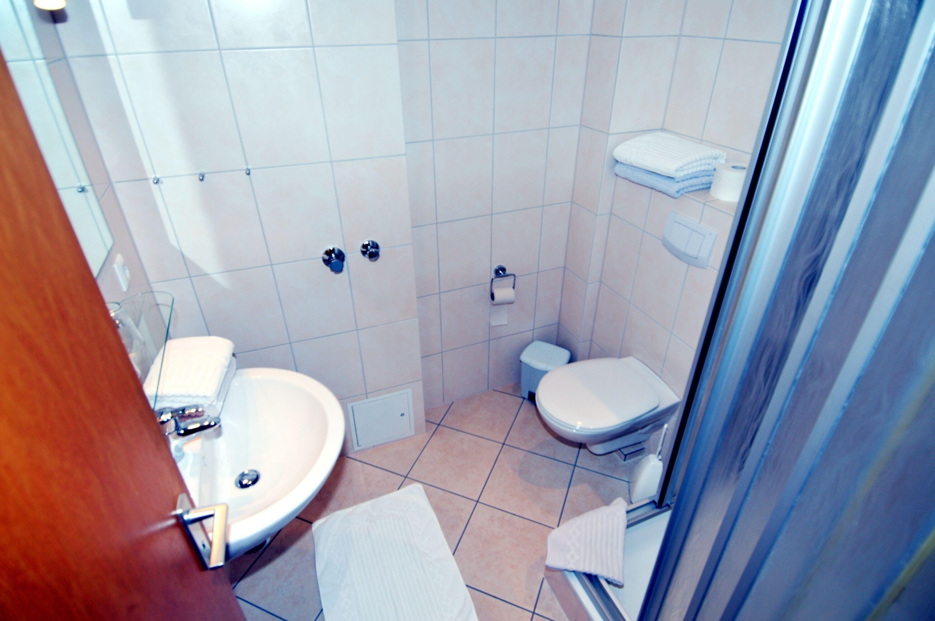 Das Badezimmer präsentiert sich gepflegt und zweckmäßig und ist mit Dusche, Waschbecken und WC ausgestattet.