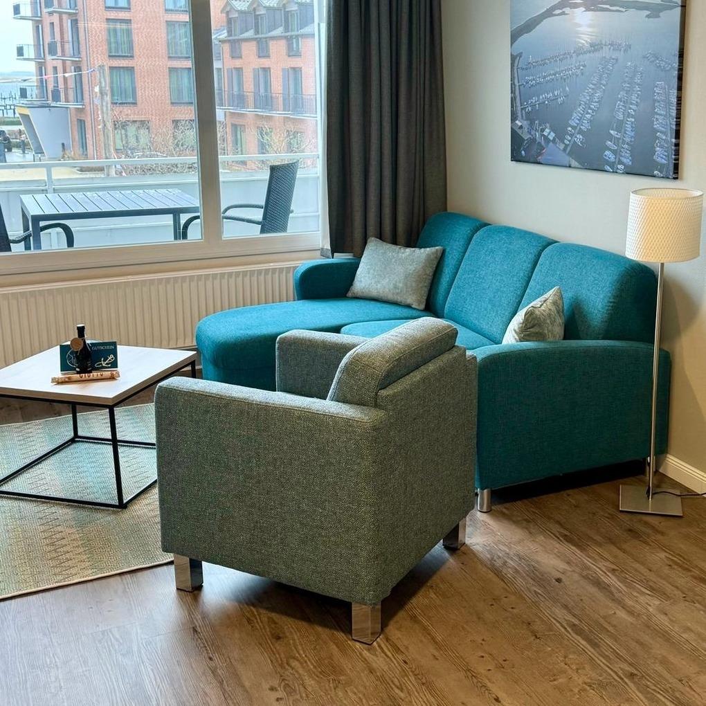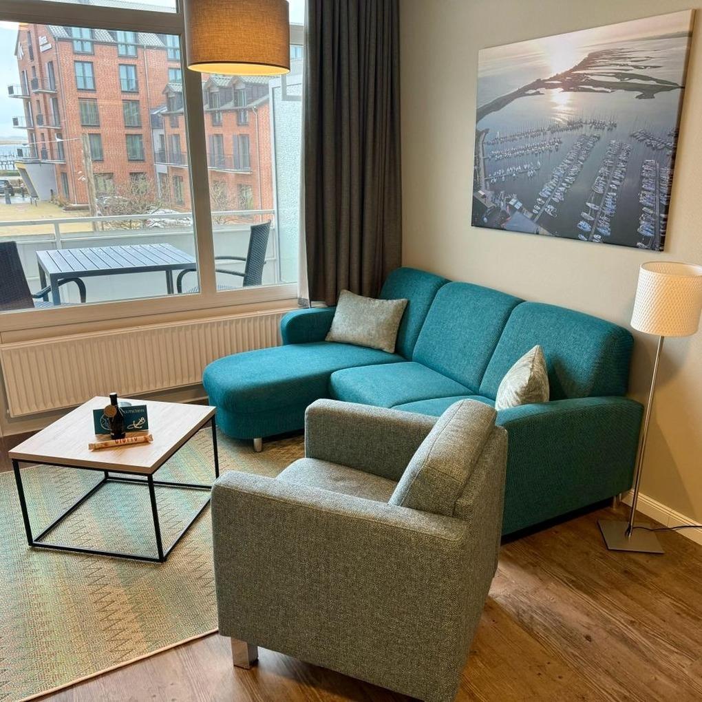Der helle Wohn- und Schlafbereich ist geschickt gestaltet und vereint Wohnen, Schlafen und Entspannen in einem angenehmen Raumkonzept. Von hier aus gelangen Sie auf den großzügig dimensionierten Balkon, der Ihnen einen wundervollen Blick auf den Yachthafen mit seinen zahlreichen Segelbooten eröffnet. Seitlich genießen Sie zusätzlich den Blick auf den Kommunalhafen, was dem Aufenthalt eine besondere maritime Atmosphäre verleiht.