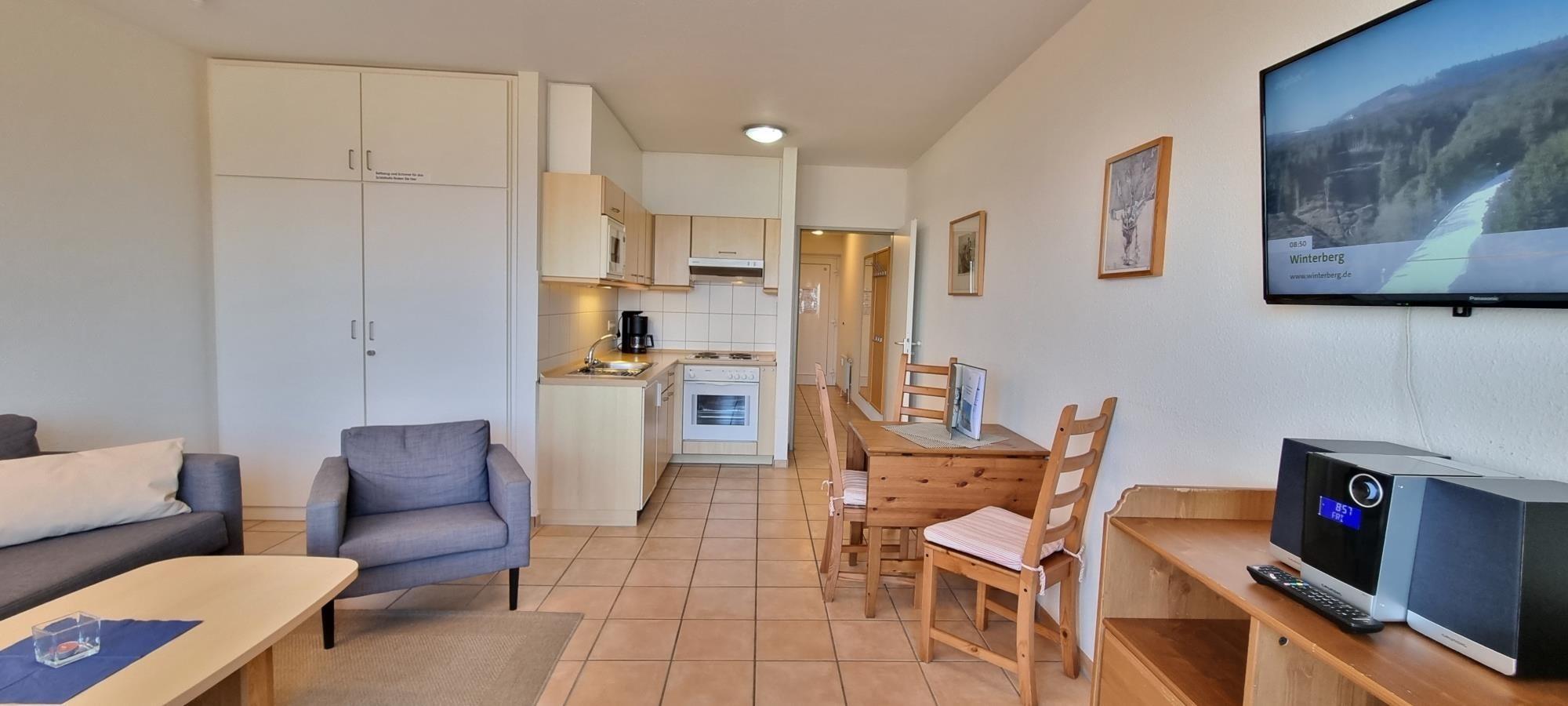 Das moderne Appartement bietet ein separates Schlafzimmer mit bequemem Doppelbett und geräumigem Kleiderschrank – ideal für entspannte Nächte nach einem erlebnisreichen Urlaubstag. Der offen gestaltete Wohn- und Essbereich ist mit einer praktischen Küchenzeile ausgestattet, die alle wichtigen Geräte für die Selbstversorgung bereithält.