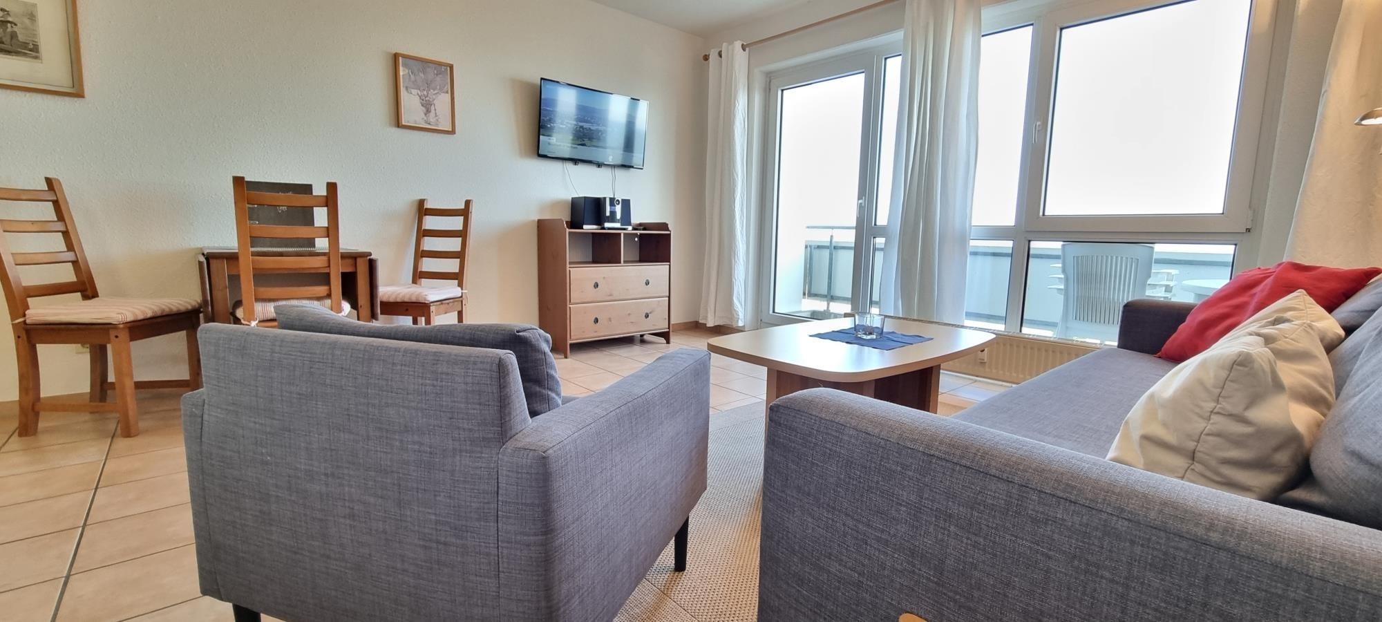 Die gemütliche Couch im Wohnzimmer verfügt über eine Schlaffunktion und lädt zum Verweilen ein – perfekt für einen Filmabend oder ein Nickerchen zwischendurch. Der Balkon auf der 3. Ebene mit Blick auf die Ostsee ist mit Gartenmöbeln ausgestattet und bietet den idealen Ort, um bei einem Glas Wein den Sonnenuntergang zu genießen oder einfach die Füße hochzulegen und zu entspannen.