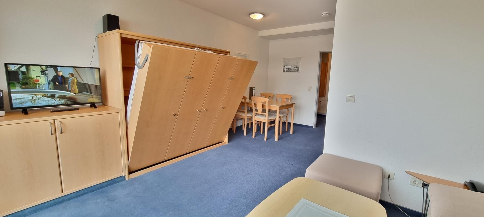Der kombinierte Wohn- und Schlafbereich ist kompakt gestaltet und verfügt über ein praktisches Doppelschrankklappbett, das tagsüber für mehr Platz sorgt und abends komfortablen Schlaf ermöglicht. Eine gemütliche Sitzecke lädt zum Entspannen ein und schafft eine angenehme Wohnatmosphäre.