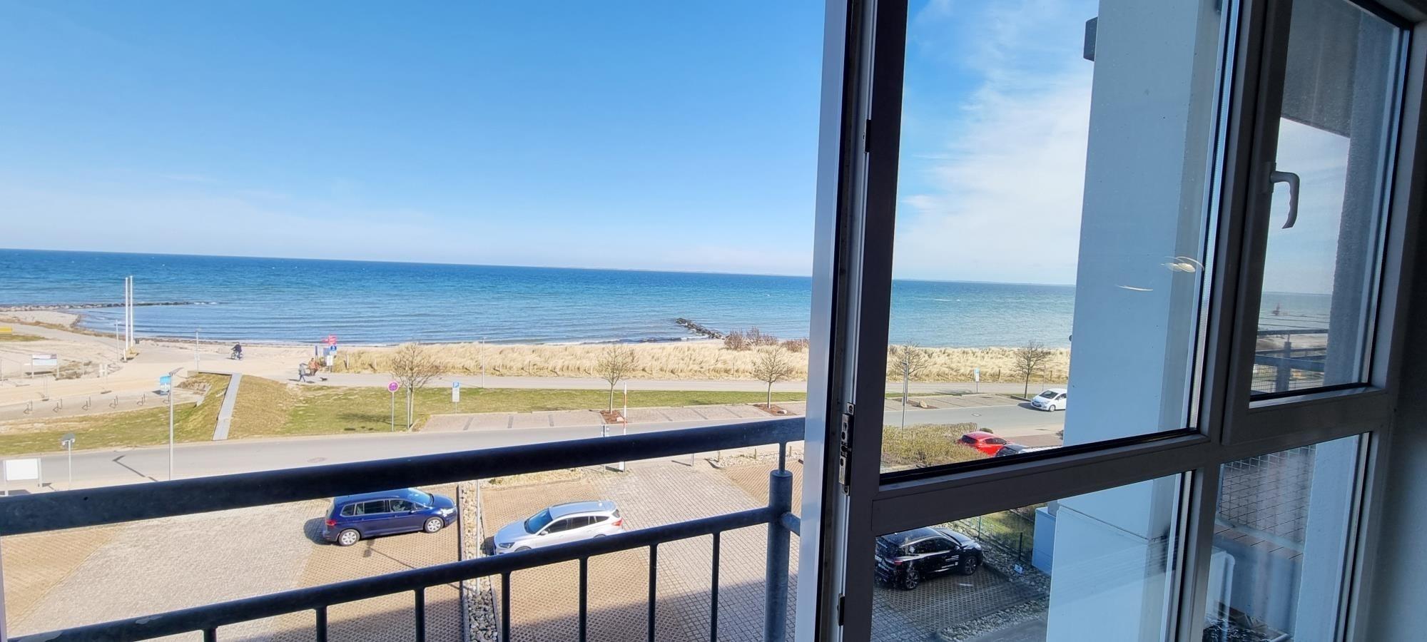 Der französische Balkon sorgt für ein offenes, lichtdurchflutetes Raumgefühl und ermöglicht es, die frische Ostseeluft und den weiten Blick direkt vom Wohnbereich aus zu genießen. Auch ohne Sitzmöglichkeit wird hier das Gefühl von Freiheit und Weite spürbar.