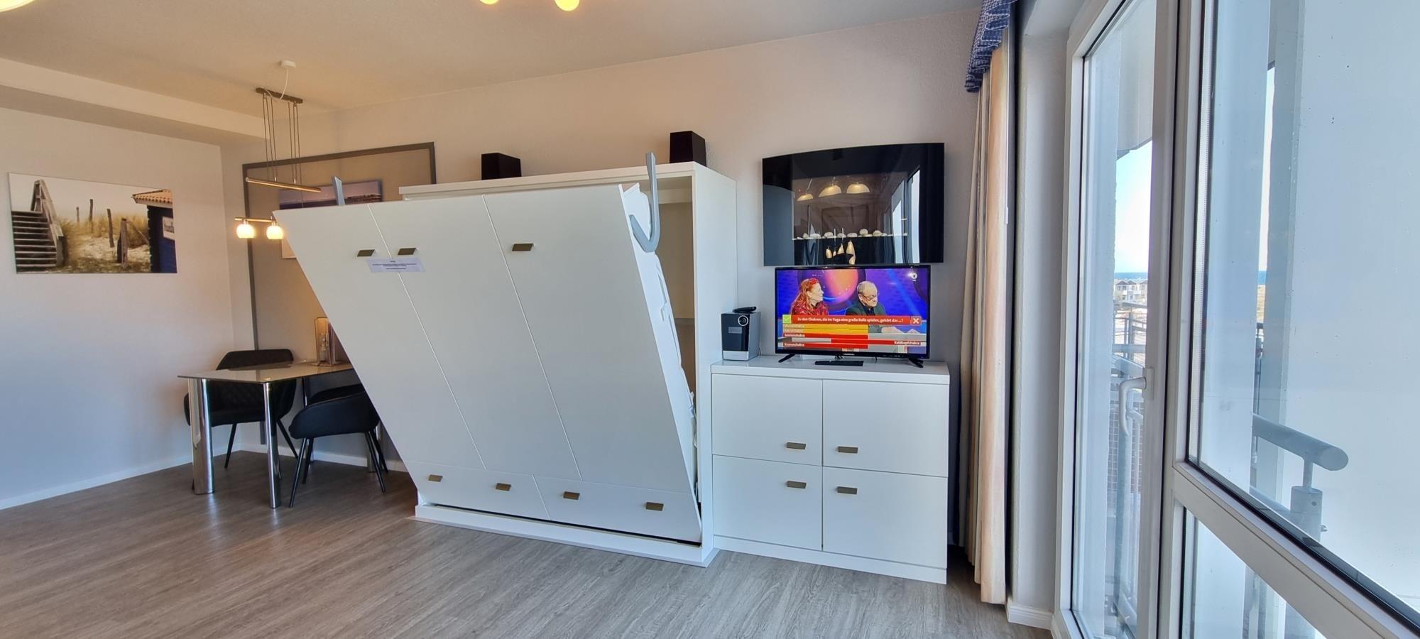 Der Wohnbereich ist durchdacht gestaltet und mit einem hochwertigen Schrankbett ausgestattet, das tagsüber für mehr Platz sorgt und abends komfortablen Schlaf ermöglicht. So vereint das Studio Funktionalität und Wohnkomfort auf kompakte Weise.