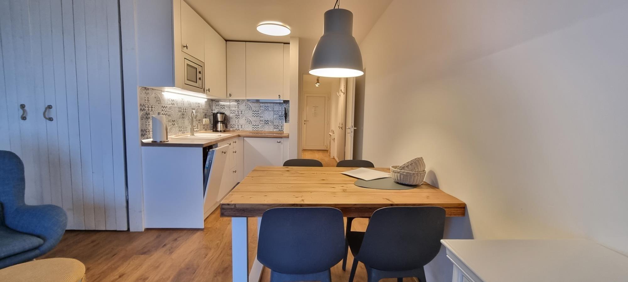 Das Schlafzimmer ist mit einem gemütlichen Doppelbett ausgestattet und bietet genügend Stauraum für Ihr Gepäck. Der Wohnbereich verfügt über eine Schlafcouch, die auch für ein Kleinkind geeignet ist, sowie einen Essbereich für entspannte Mahlzeiten. Die offene Küchenzeile ist komplett ausgestattet, sodass Sie Mahlzeiten einfach selbst zubereiten können.