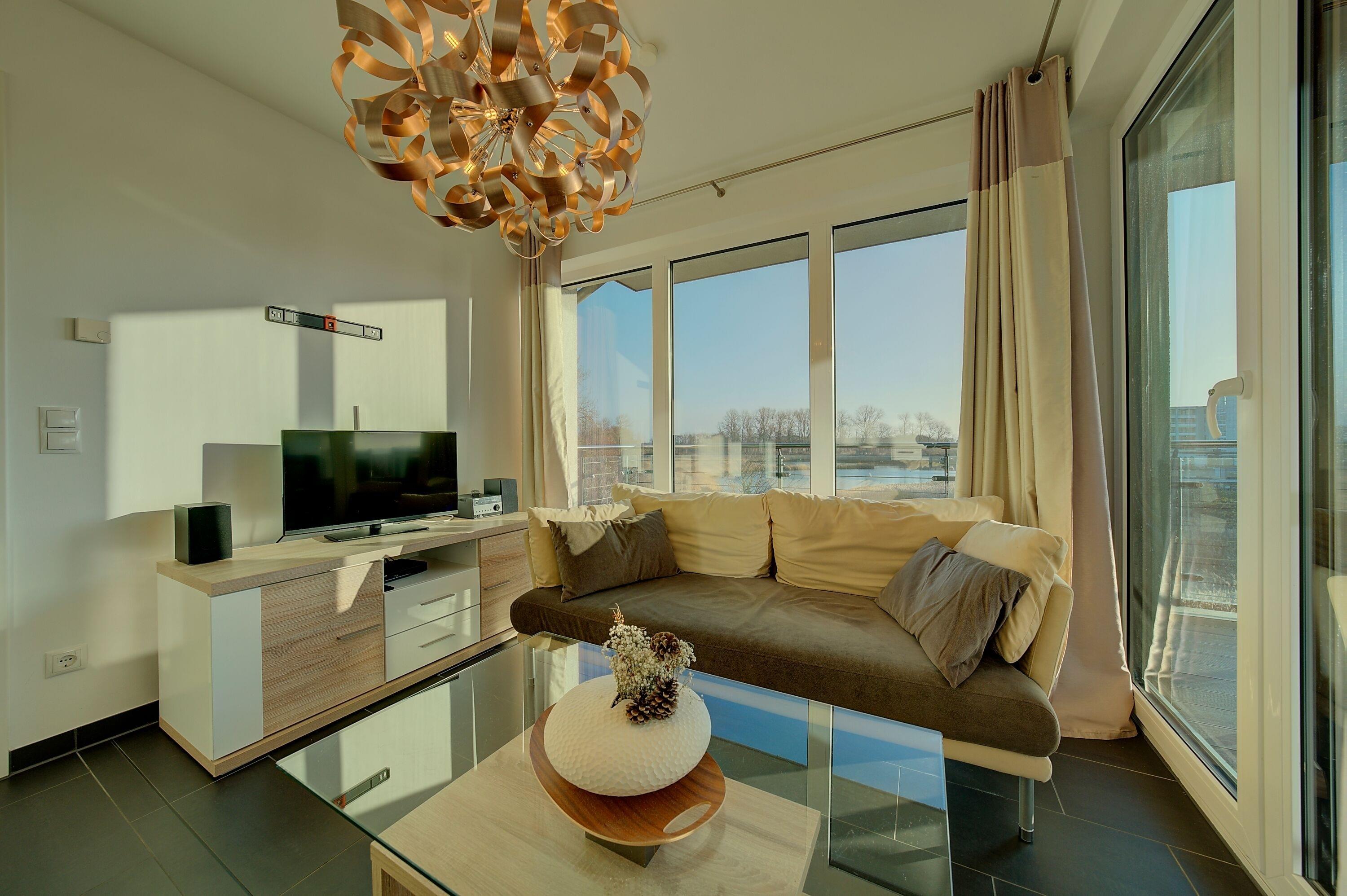 Der lichtdurchflutete Wohnbereich bildet das Herzstück der Wohnung. Eine gemütliche Sofaecke lädt zum Entspannen ein, während ein Flatscreen-TV sowie eine kleine Auswahl an Büchern für Unterhaltung sorgen. Der angrenzende Essbereich bietet bequem Platz für bis zu vier Personen und ist ideal für gemeinsame Mahlzeiten oder gesellige Abende.