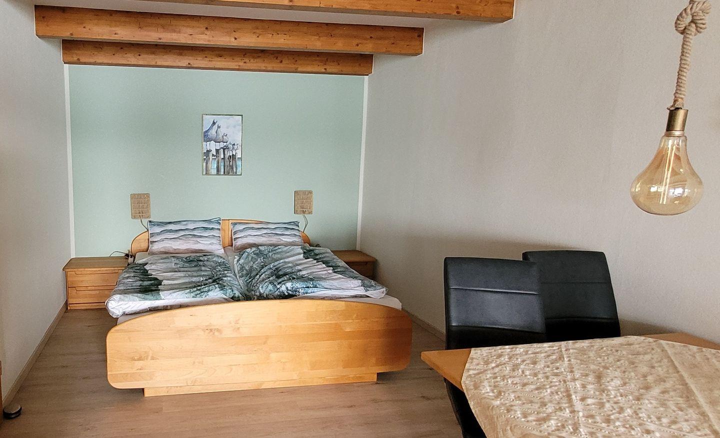 Der Schlafbereich mit einem Doppelbett ist vom Wohnzimmer durch einen Vorhang abgetrennt.