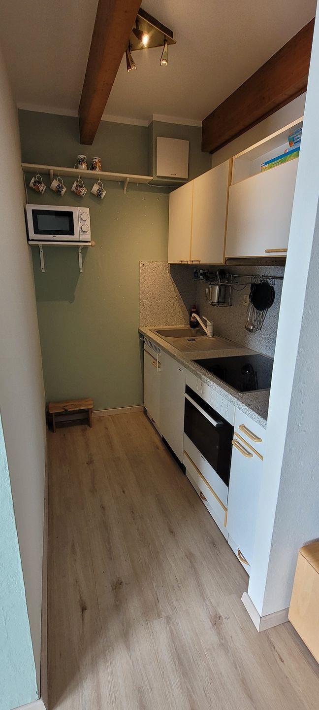Die Küche ist für 4 Personen voll ausgestattet und bietet Ihnen einen Backofen mit Cerankochfeld, Kühlschrank mit Gefrierfach und die üblichen Utensilien wie Toaster und Wasserkocher.
