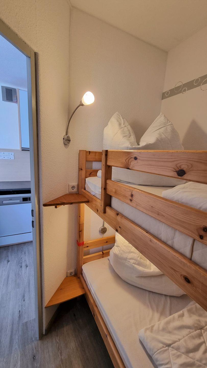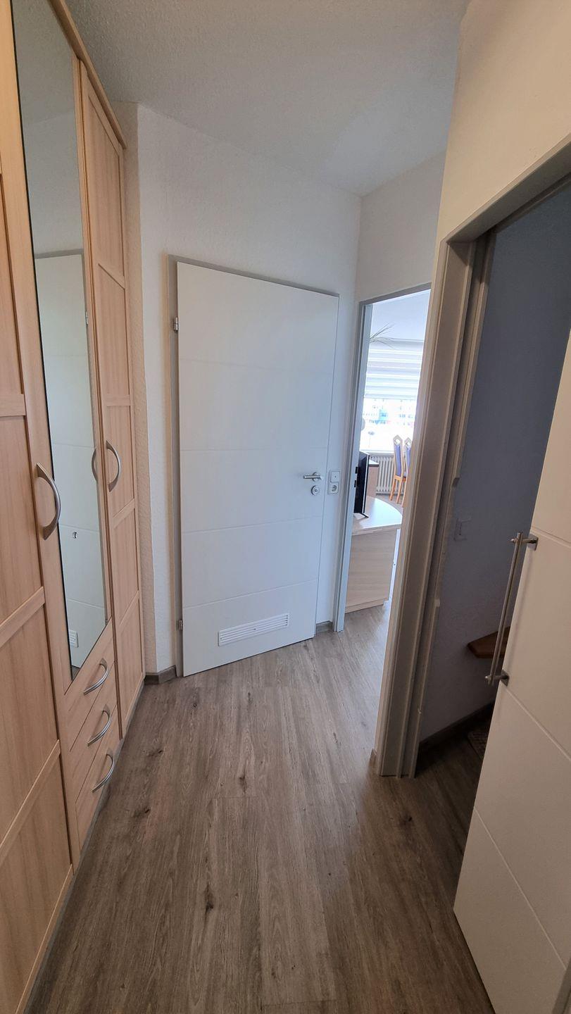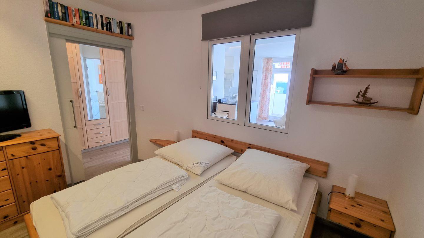 Willkommen in Ihrer stilvollen Wohlfühloase über den Dächern – diese modern renovierte Ferienwohnung im 8. Obergeschoss bietet auf rund 45 m² den perfekten Rückzugsort für bis zu vier Personen. Helle Räume, eine durchdachte Aufteilung und eine geschmackvolle Einrichtung schaffen eine Atmosphäre, in der man seinen Urlaub wie zu Hause verbringen kann. Der großzügige Wohnbereich lädt mit gemütlicher Couch, komfortablen Sesseln und großem Flachbild-TV (80 cm Durchmesser) zu entspannten Abenden ein. Große Fenster sorgen für viel Licht und eine freundliche, offene Stimmung. Der angrenzende Essbereich bietet ausreichend Platz für gemeinsame Mahlzeiten und gesellige Stunden. Die moderne, offen gestaltete Küche ist bestens ausgestattet und lässt keine Wünsche offen: Cerankochfeld, Backofen, Spülmaschine, Mikrowelle, Kühlschrank mit Gefrierfach sowie Kaffeemaschine und Toaster stehen für Sie bereit. Hier wird aus leckeren Zutaten im Handumdrehen ein genussvoller Urlaubsabend. Im separaten Schlafzimmer erwartet Sie ein komfortables Doppelbett (2 x 0,9 m x 1,9 m) sowie ein zusätzlicher Fernseher für entspannte Stunden. Zwei weitere Schlafplätze befinden sich in einem abgetrennten Bereich mit praktischem Doppelstockbett (2 x 0,8 m x 1,9 m) – ideal für Familien oder kleine Gruppen. Das helle, modern gestaltete Badezimmer überzeugt mit bodengleicher Dusche, Hänge-WC und stilvollem Spiegelschrank. Auch technisch ist die Wohnung bestens ausgestattet: WLAN, zwei Fernseher sowie Radio sorgen für Unterhaltung und Komfort. Der kleine Balkon rundet das Angebot ab. Vom Balkon eröffnet sich ein herrlicher Ausblick über den Binnensee und den Innenhof – und wenn das Wetter mitspielt, schweift der Blick sogar bis zum Jachthafen.