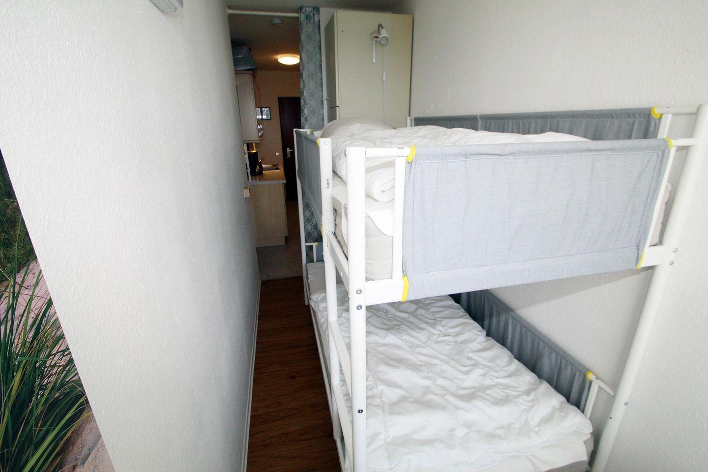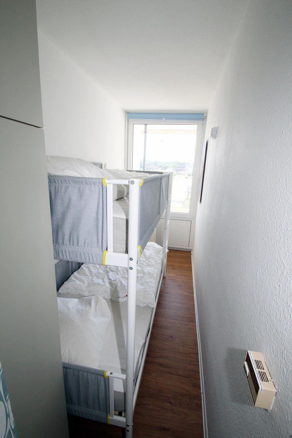Ein separates Kinderzimmer mit Etagenbett und eigenem Fenster mit Seeblick geht vom Flur ab zum davor liegenden Balkon.