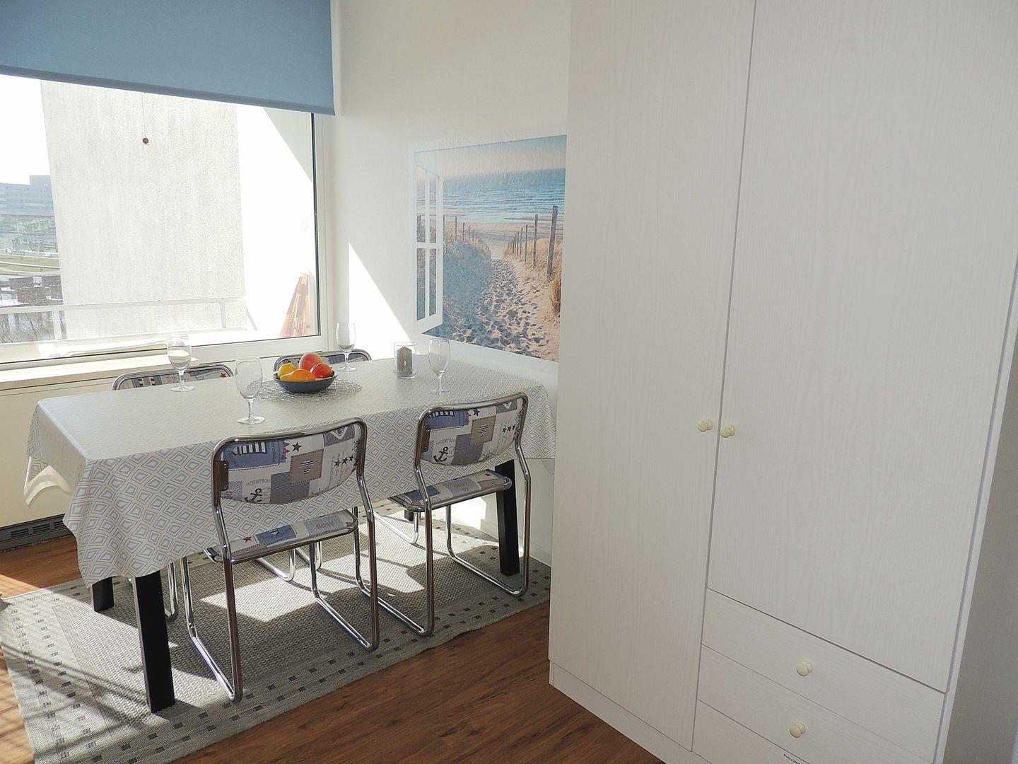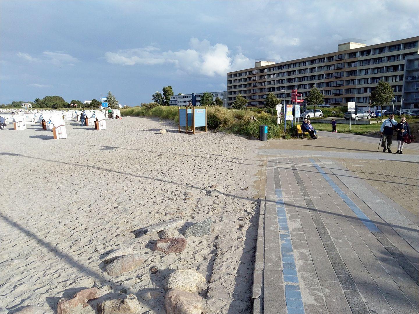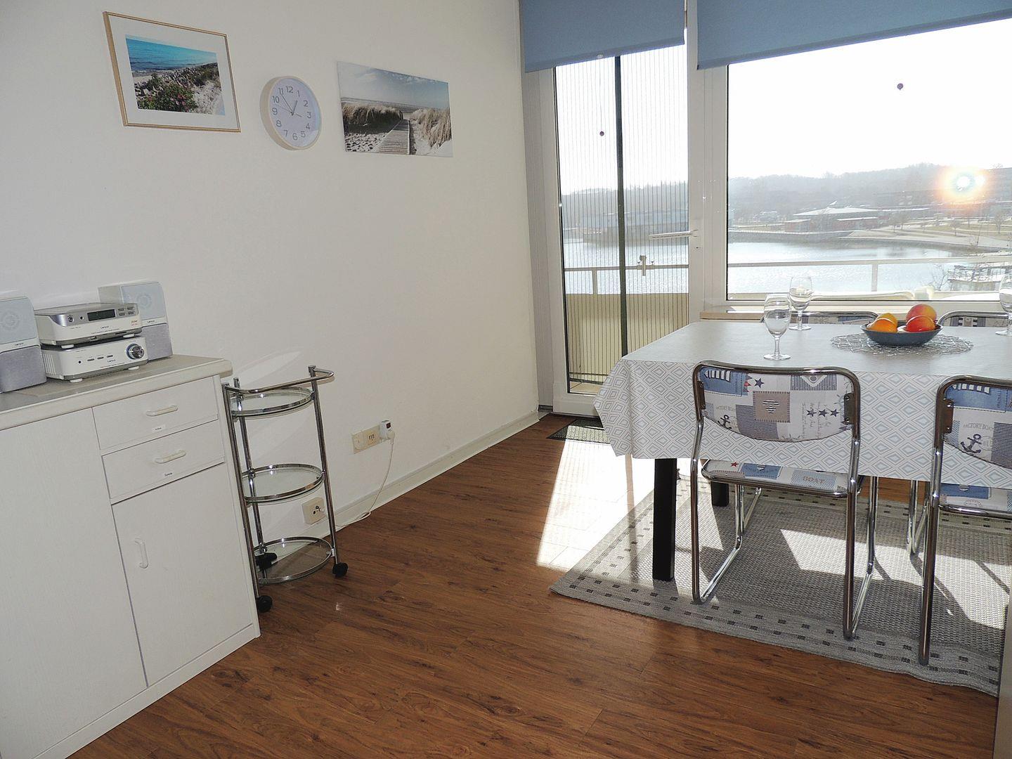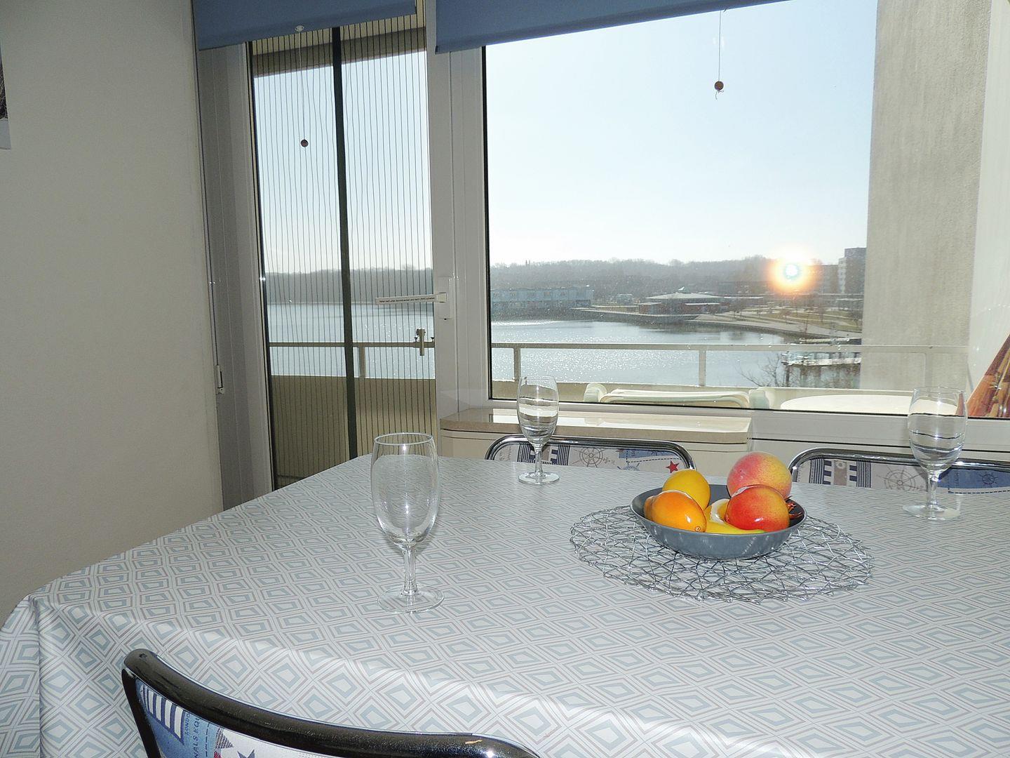 Schönes Appartement im dritten Stock mit Fahrstuhl zur Binnenseeseite mit herrlichem Blick auf das Ferienparkufer mit Steg und Promenade. Der Ostsee-Sandstrand mit Strandkorbverleih ist nur über die Straße entfernt und die nächsten öffentlichen Toiletten am Strand sind weiter entfernt, als das eigene Klo des Appartments.