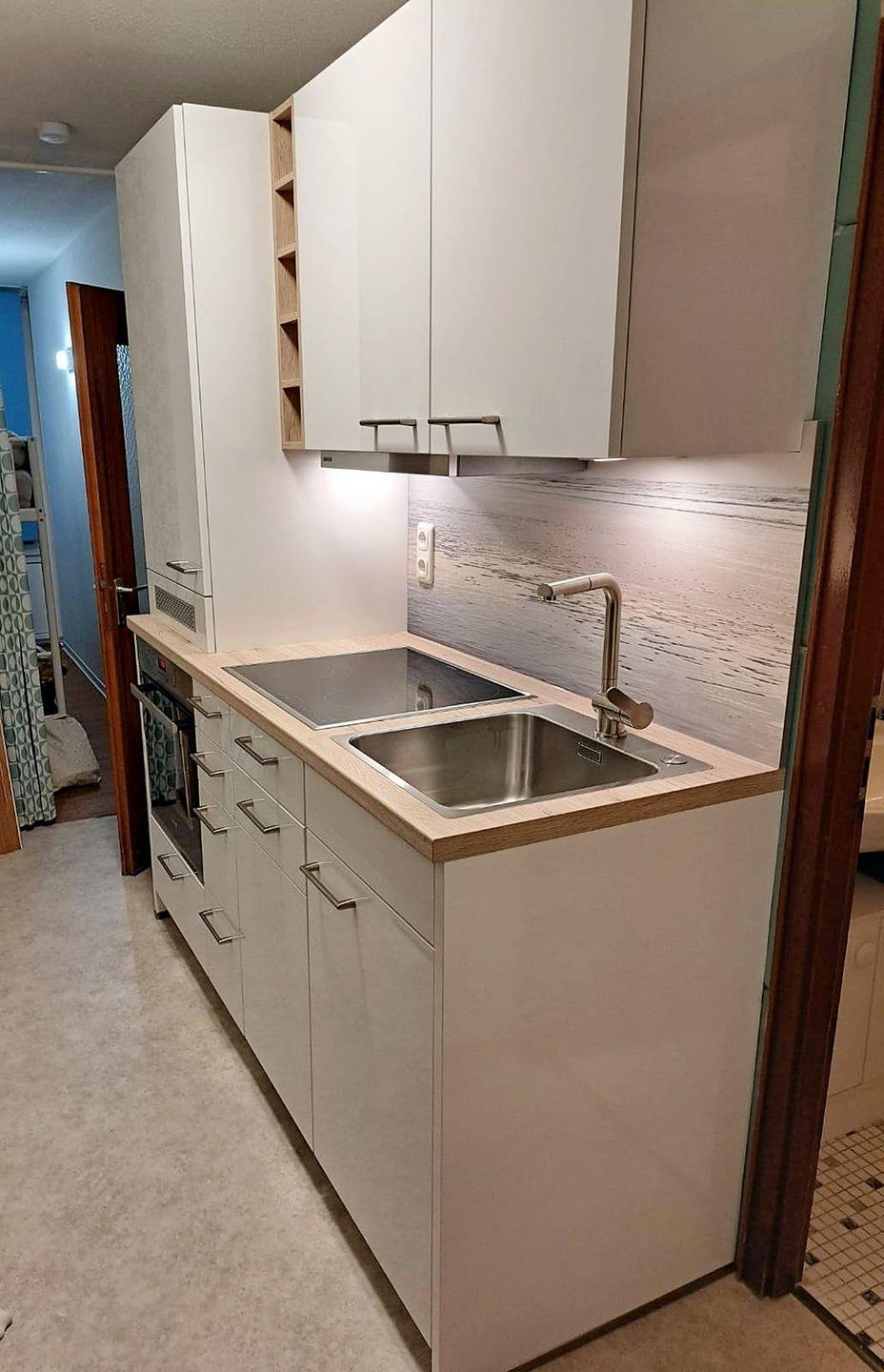 Die neuwertige Küche verfügt über einen Backofen, eine Spülmaschine, Kühlschrank und Cerankochfeld sowie alle üblichen Utensilien.
