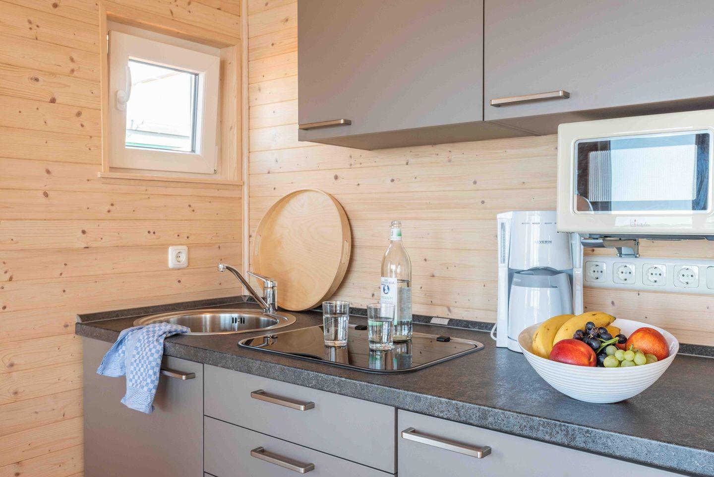 Drinnen erwartet unsere Gäste ein gemütlicher Wohn-Essbereich mit komplett ausgestatteter Küchenzeile und Esstisch. Dazu zwei Schlafzimmer, kleines Duschbad und separates WC.