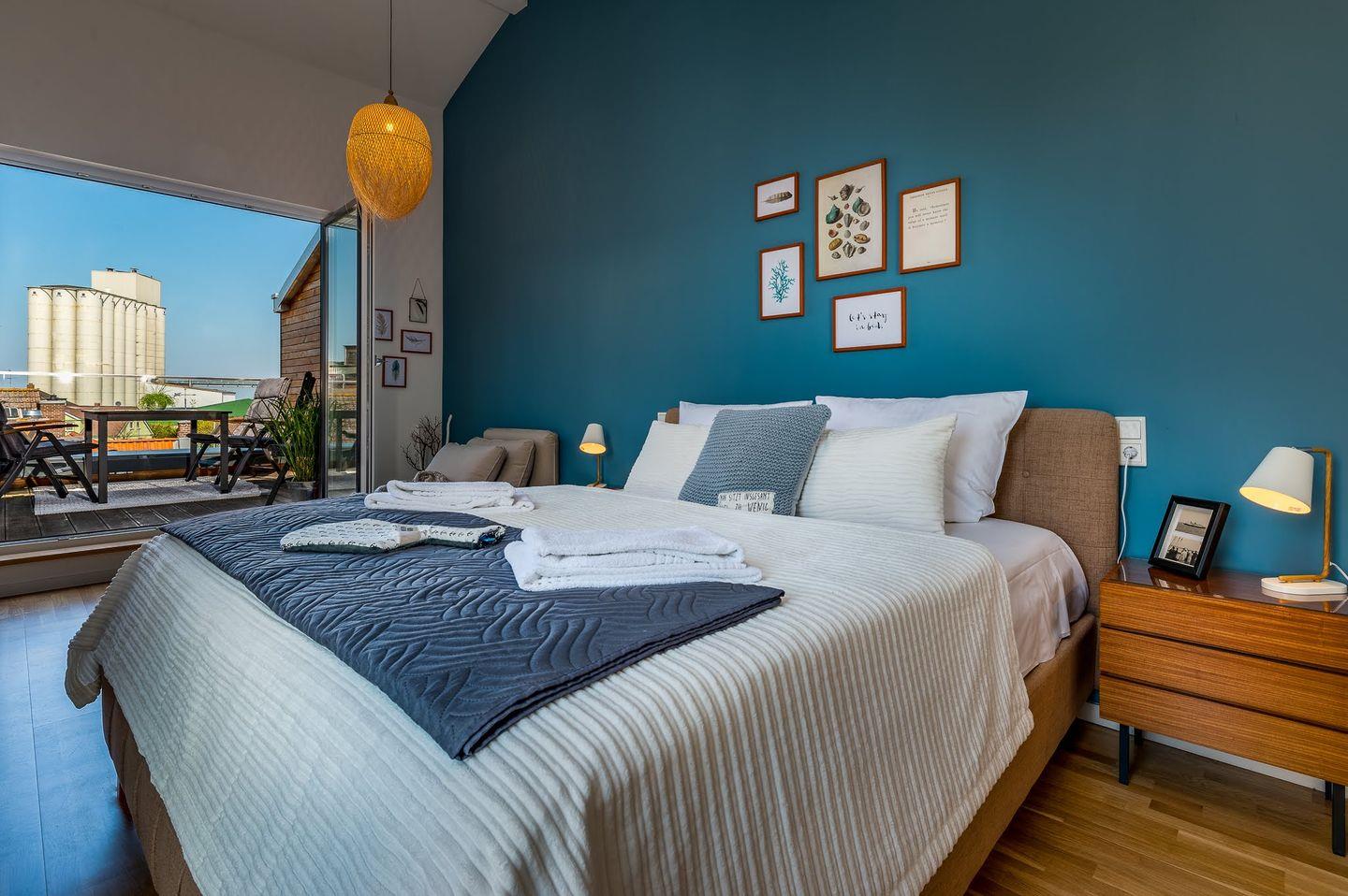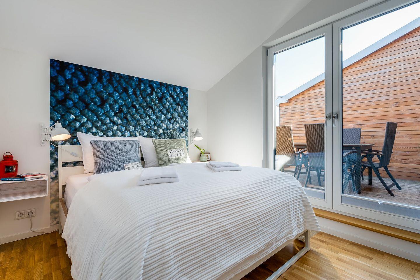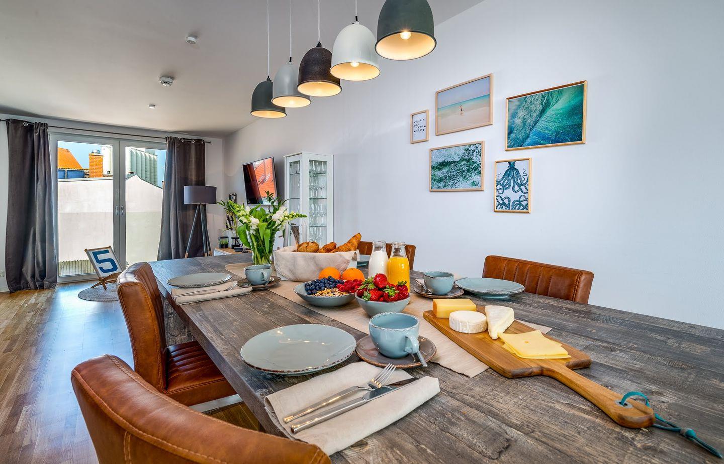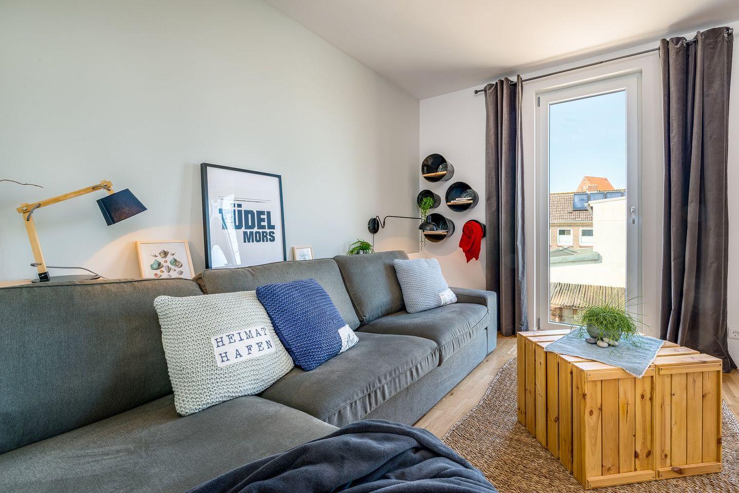 Hafennahe Maisonette-Ferienwohnung für 5 Personen mit möblierten Balkonen und offenem Wohn-, Ess- & Küchenbereich -850m zum Strand