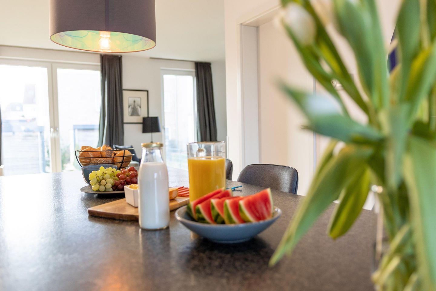 Freuen Sie sich im Erdgeschoss auf einen hellen Wohnbereich mit einem Essbereich und einer voll ausgestatteten Küche mit einer 3,50m langen Kochinsel. Das Gäste-WC, die Garderobe im Eingangsbereich und der Waschraum runden den unteren Bereich ab.