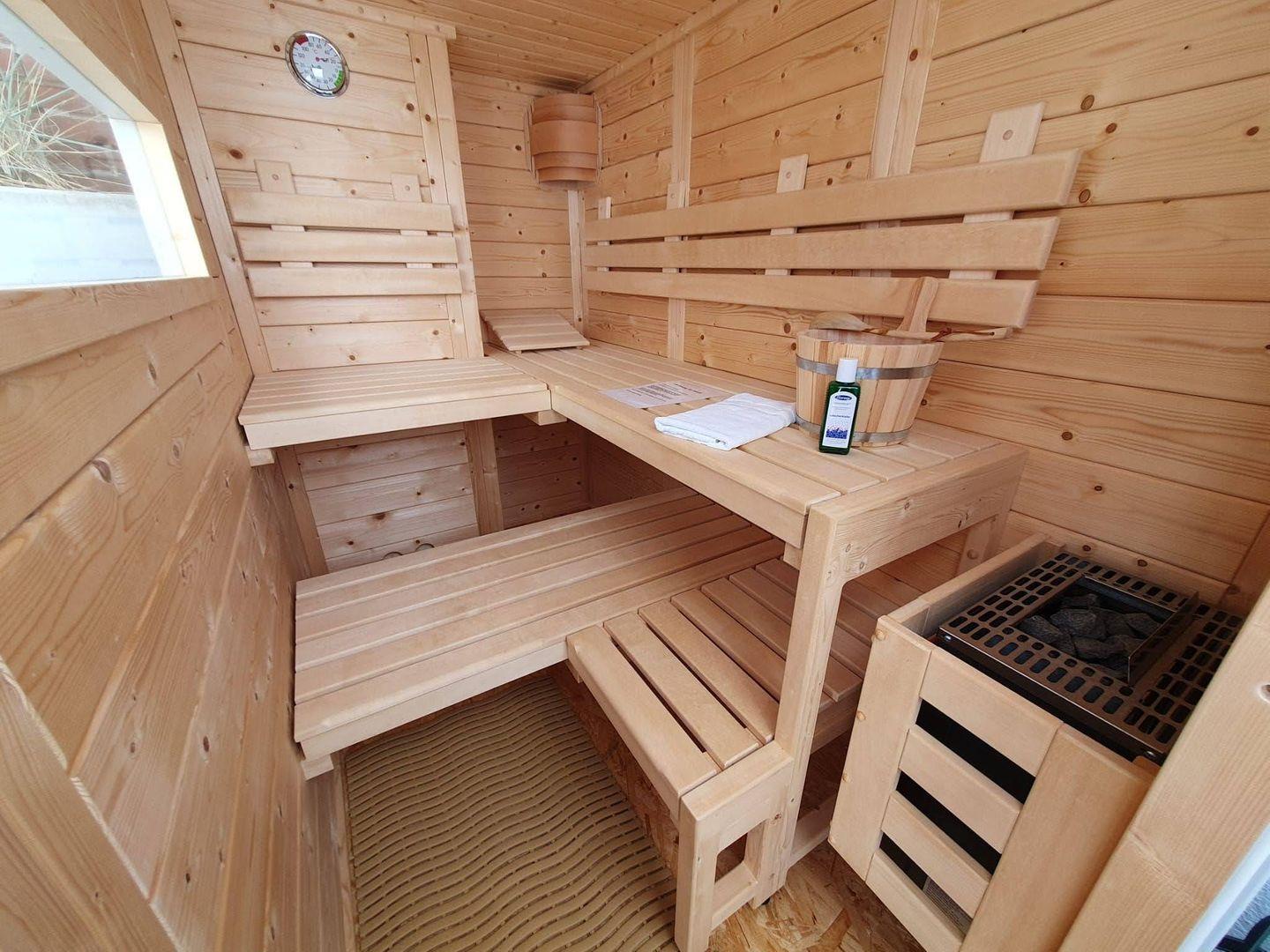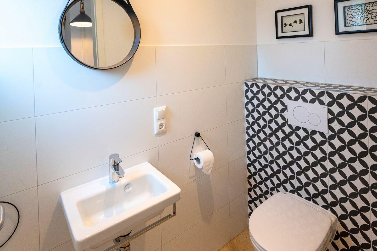 Im Erdgeschoss befinden sich ein Gäste-WC, die offene Wohnküche, eine Essecke, das Wohnzimmer mit Smart-TV sowie der Zugang zur 25 m² großen Terrasse. Die vollständig geschützte und sehr ruhige Hinterhof-Terrasse wird durch eine schöne Sauna ergänzt.