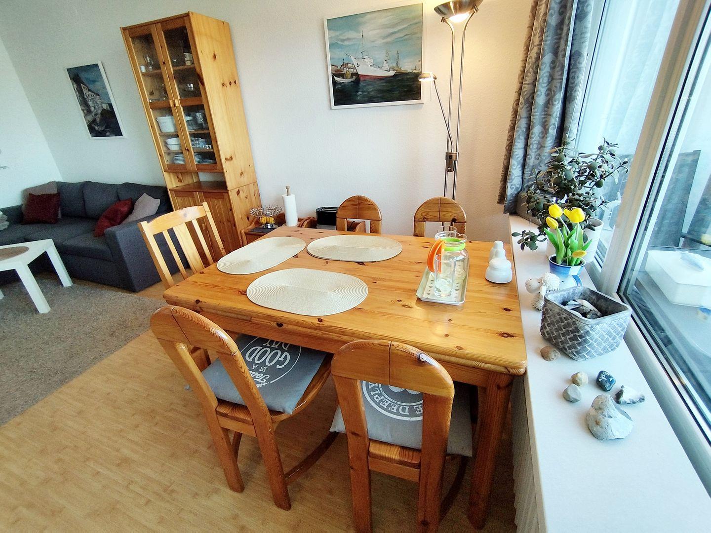 Die Essecke befindet sich am Fenster, von wo aus Sie den Blick in Richtung Leuchtturm und Steilküste (nach Westen) haben.