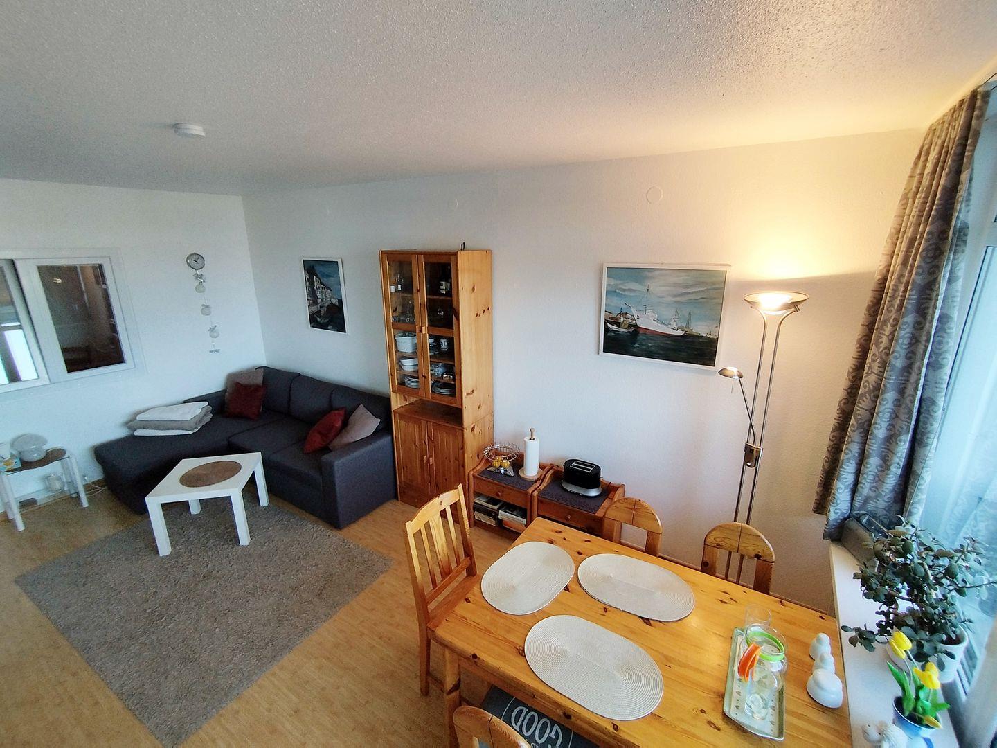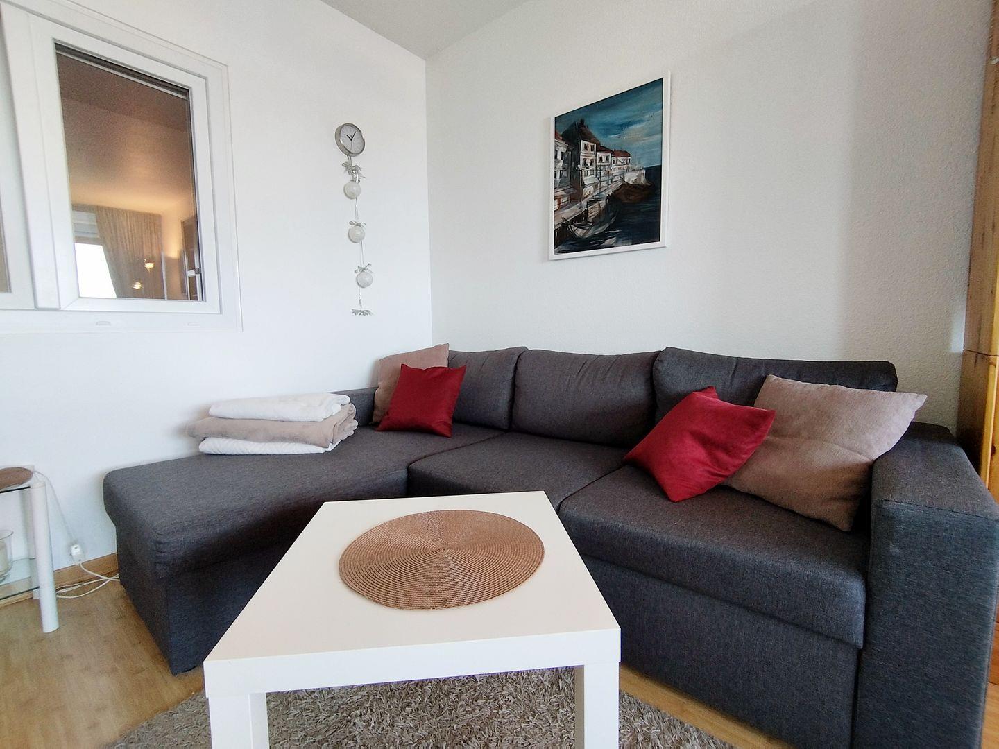 Der Wohnraum ist mit einer Couchgarnitur, welche auch als Schlafcouch genutzt werden kann, einem Flachbild-TV sowie kostenfreiem WLAN ausgestattet.