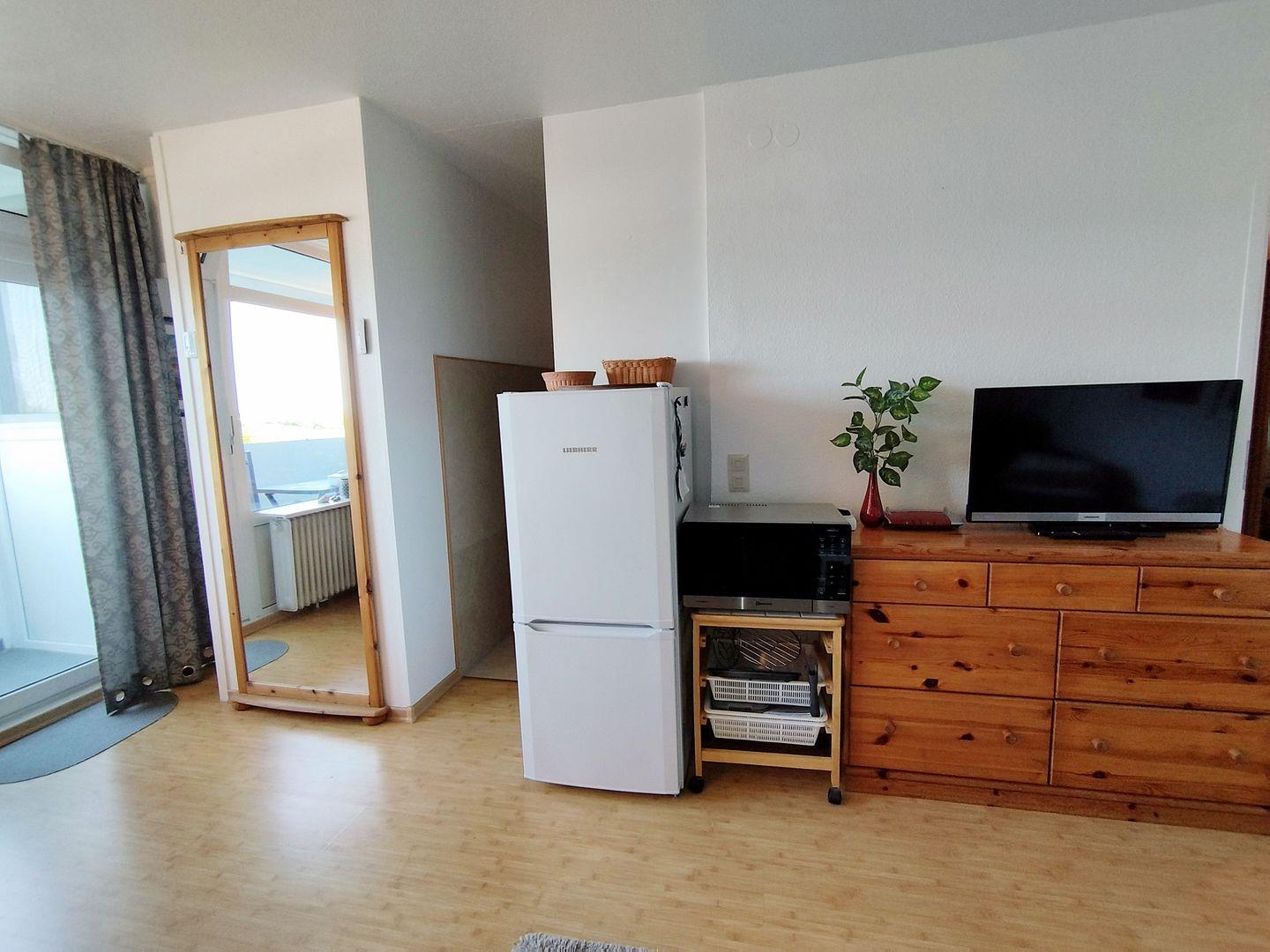 In der Küche befindet sich ein 4-Zonen-Cerankochfeld, ein Kühlschrank sowie die üblichen Küchenutensilien wie Toaster, Wasserkocher und Kaffeemaschine.