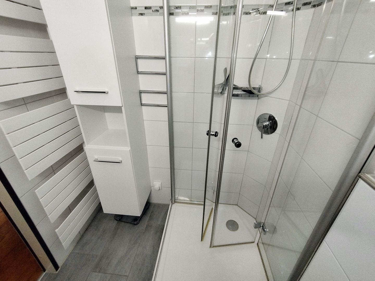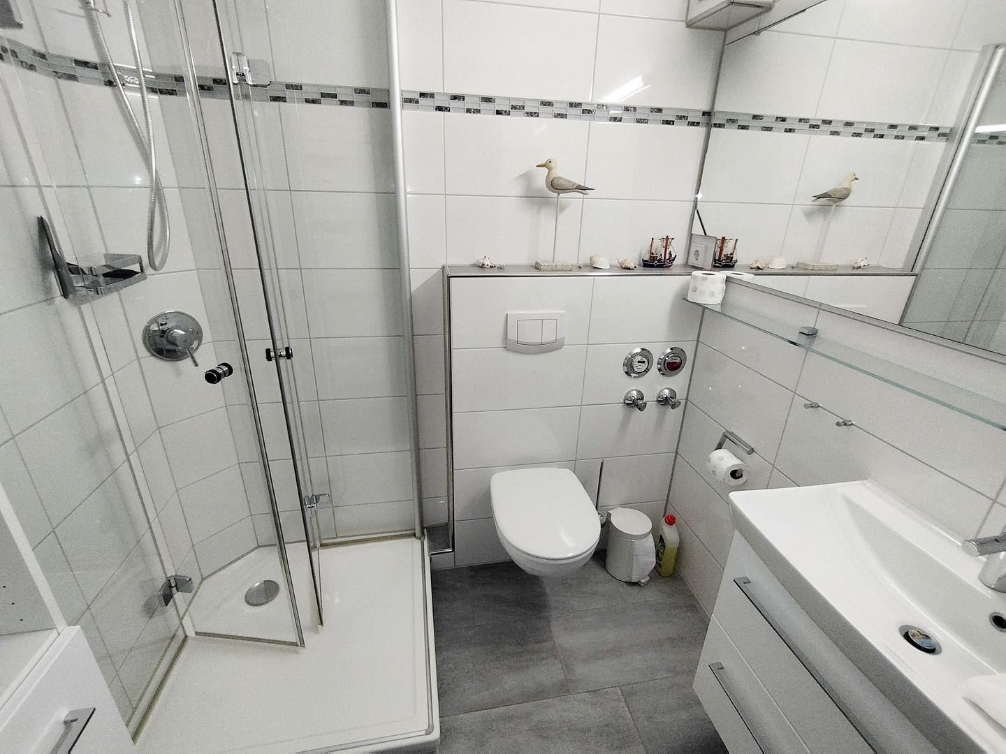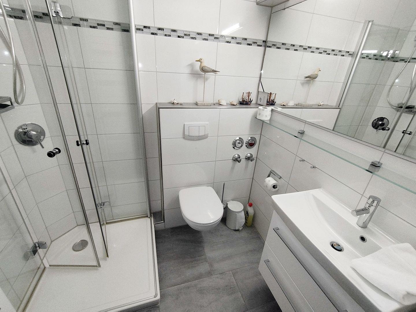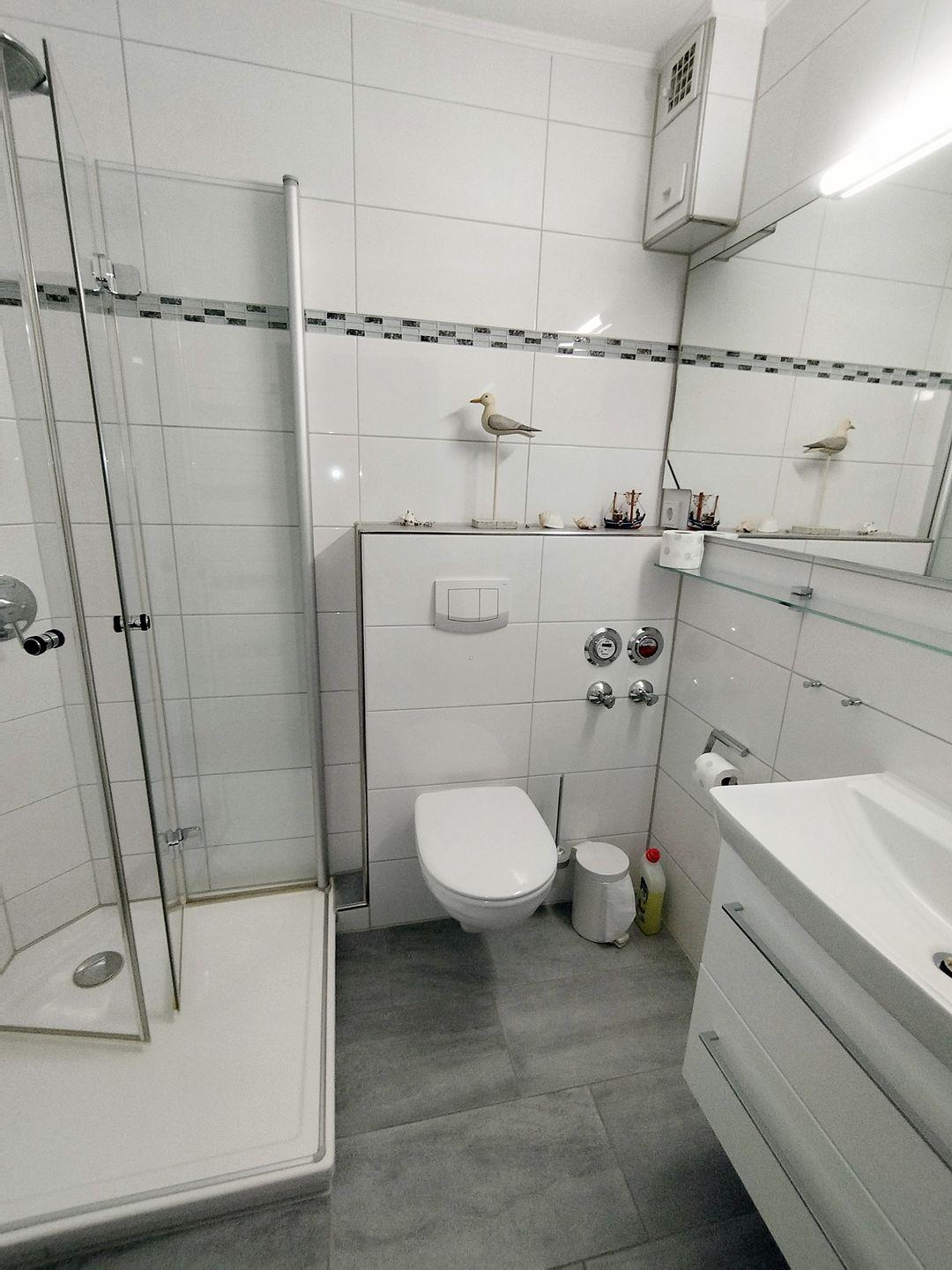 Badezimmer mit moderner Duschkabine, Waschbecken inkl. großem Spiegel, WC sowie Handtuchheizkörper.