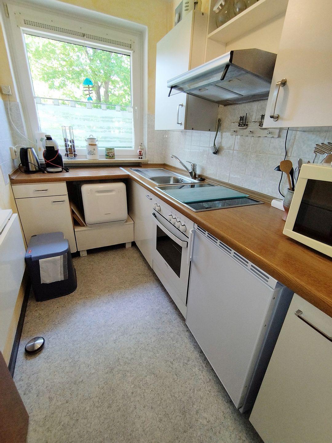 Die Küche ist mit einem Backofen, Kochfeld, einer kleinen Spülmaschine augestattet.