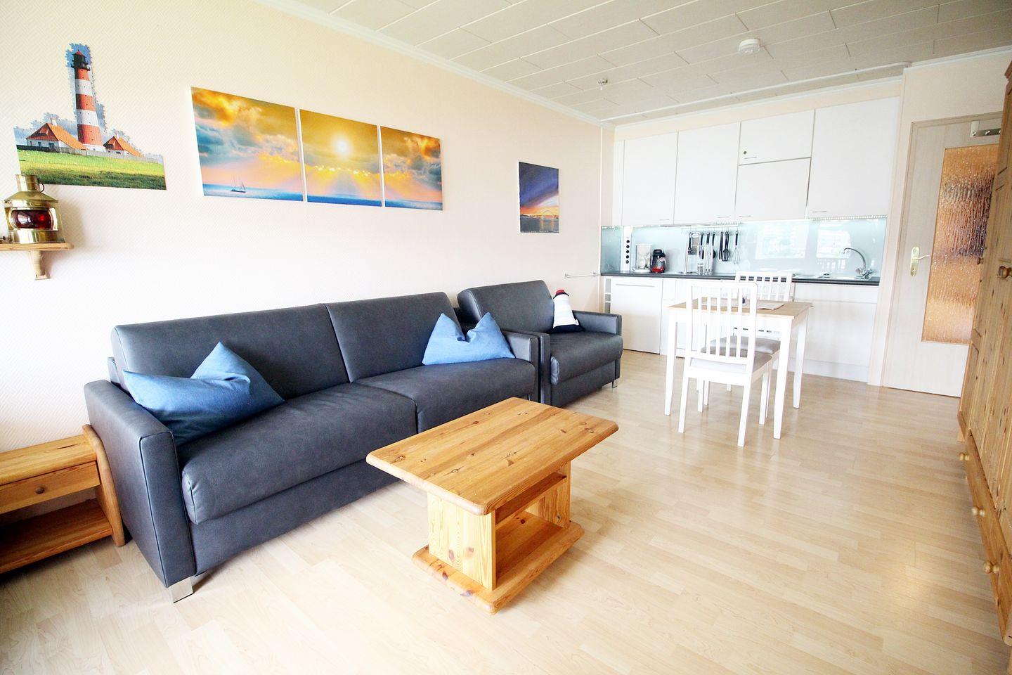 Der helle Wohnbereich lädt nach einem erfrischenden Strandtag oder für einen gemütlichen Abend zum Abschalten ein. Sie können sich auf einen 50 Zoll SMART-TV freuen, der Netflix, YouTube und Magenta-TV bietet, sowie auf kostenfreies WLAN. Eine moderne Musikanlage mit Bluetooth sorgt für die passende Hintergrundmusik. Für erholsame Nächte stehen Ihnen zwei hochwertige Schlaflösungen zur Verfügung: eine komfortable Doppelschlafcouch und eine separate Einzelschlafcouch. Beide sind mit Lattenrost und hochwertigen Matratzen ausgestattet, die deutlich mehr Komfort bieten als klassische Schlafsofas – ideal, auch wenn Sie mehrere Nächte bleiben. Außenjalousien garantieren eine angenehme Verdunkelung für eine ruhige Nachtruhe.