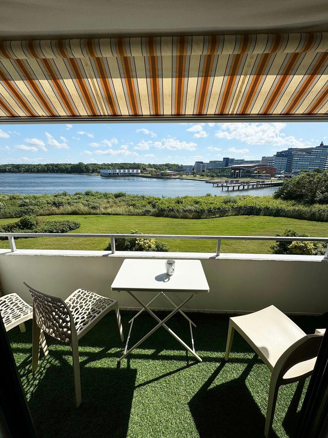 Genießen Sie sonnige Stunden auf dem Balkon, der dank einer Markise auch an warmen Tagen angenehm schattig bleibt. Ein besonderes Highlight: Im Schrank befindet sich eine Indoor-Schaukel, die bei Bedarf einfach befestigt werden kann – eine kleine Freude für Groß und Klein!
