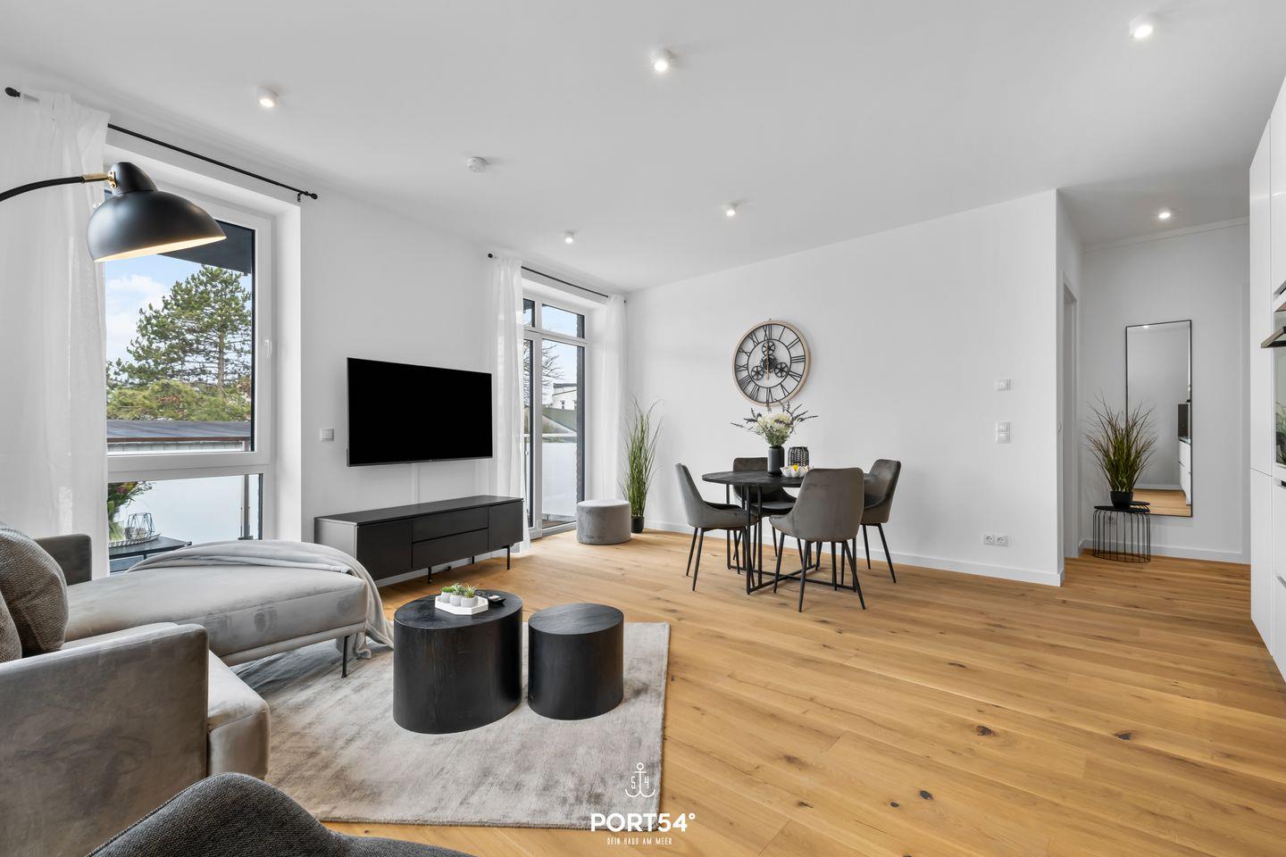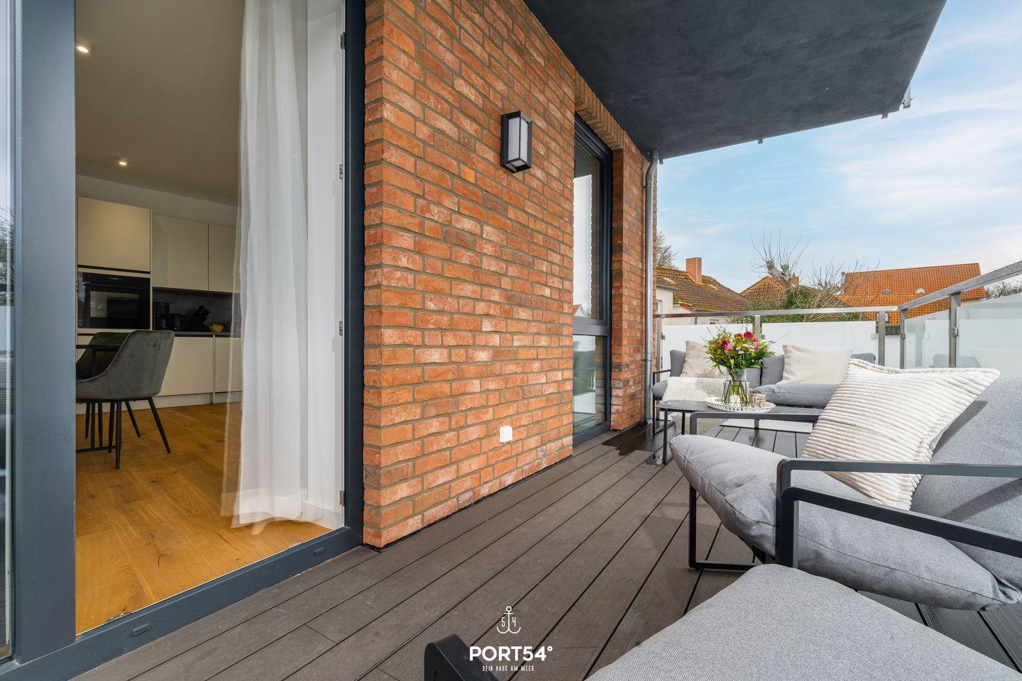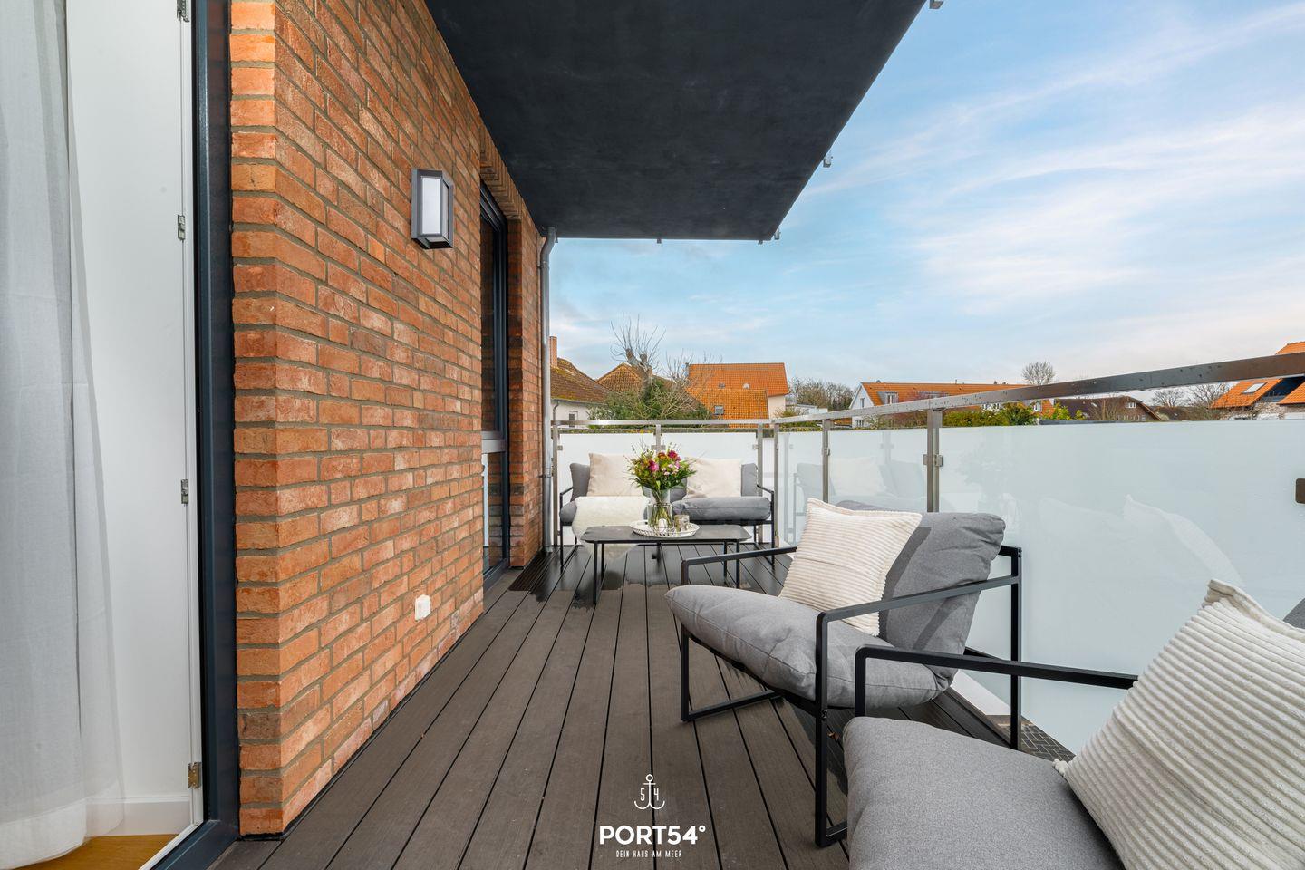 Vom Wohnzimmer gelangst du direkt auf den Balkon, wo du die frische Meeresluft und den Blick auf die Umgebung genießen kannst. Die ruhige Lage sorgt für eine entspannte Atmosphäre. Einkaufsmöglichkeiten, Restaurants und Cafés sind nur wenige Schritte entfernt, während der feinsandige Strand nur 500 Meter entfernt liegt – ideal für sonnige Stunden, lange Spaziergänge oder Wassersportarten wie Windsurfen und Segeln.