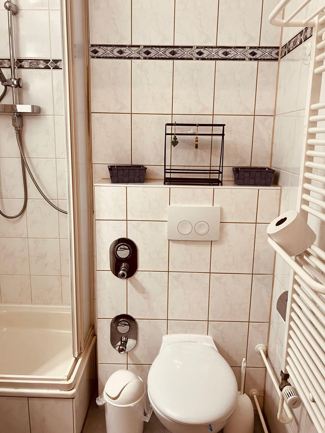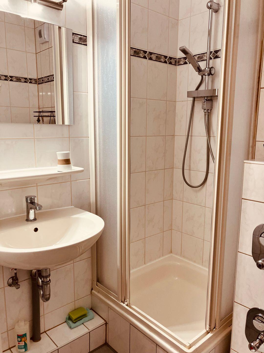 Das Badezimmer ist mit einer Dusche (mit Wanne) sowie einem WC, Waschbecken und Spiegel funktional und zeitgemäß ausgestattet.