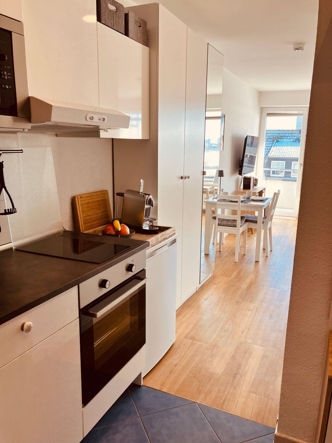 Die integrierte Küche ist gut ausgestattet und bietet alles für eine komfortable Selbstversorgung – inklusive Kochfeld, Backofen sowie Espresso- und Kaffeemaschine. Der Essbereich lädt zu gemeinsamen Mahlzeiten in entspannter Atmosphäre ein.