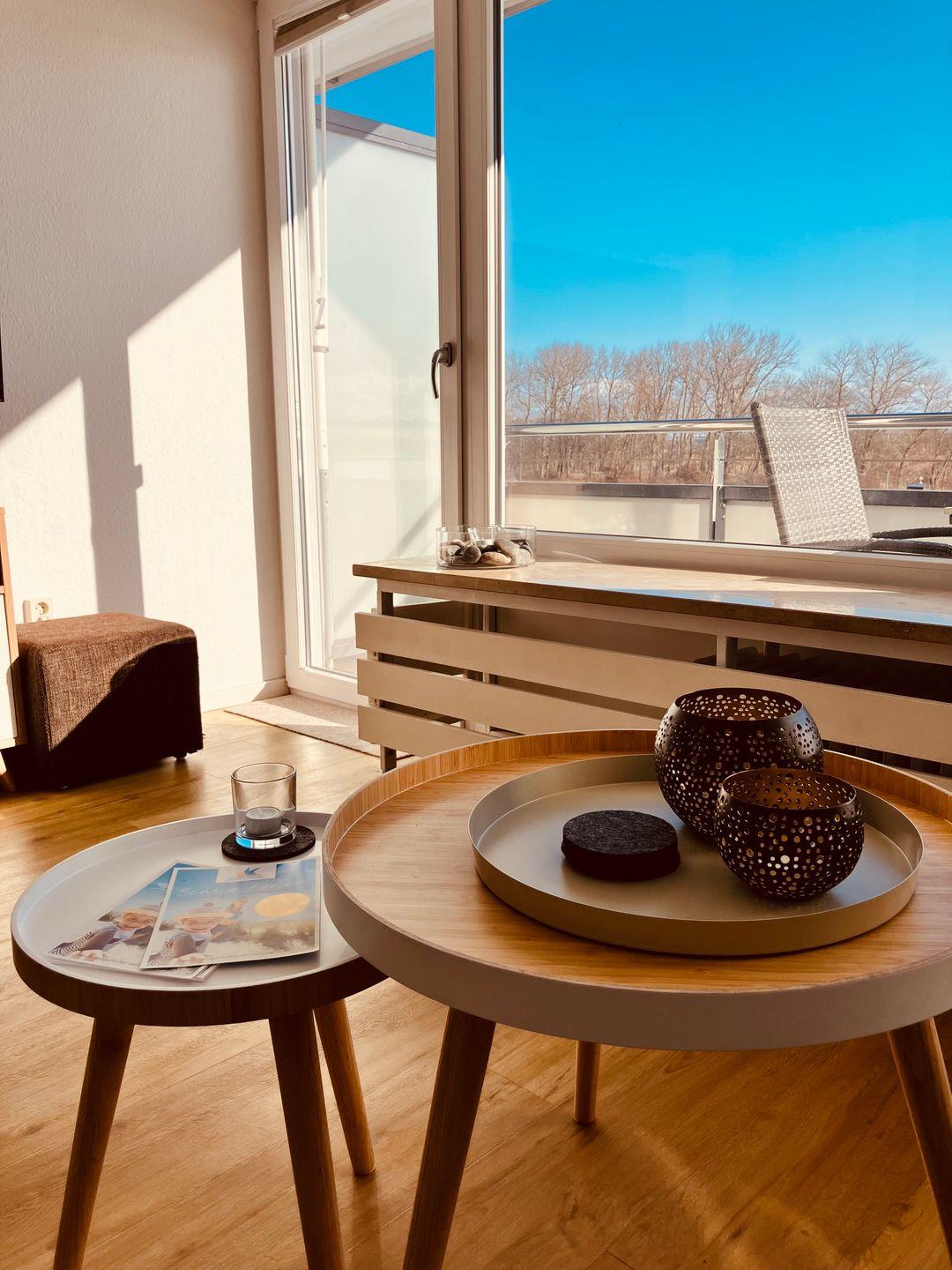 Der kombinierte Wohn- und Schlafbereich präsentiert sich modern und zugleich gemütlich. Warme Holztöne, harmonisch abgestimmte Möbel und sorgfältig ausgewählte Accessoires schaffen eine angenehme Wohlfühlatmosphäre. Besonders charmant sind die zahlreichen Bilder von Heiligenhafen, die der Wohnung eine persönliche Note verleihen und die Verbundenheit zur Region stilvoll unterstreichen.