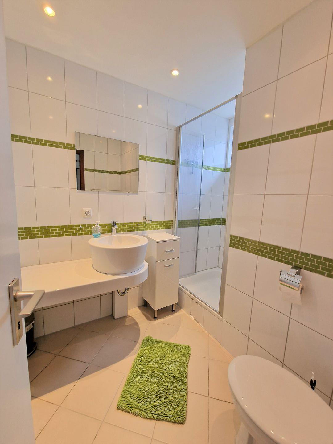 Das helle Bad ist mit Duschkabine ausgestattet.