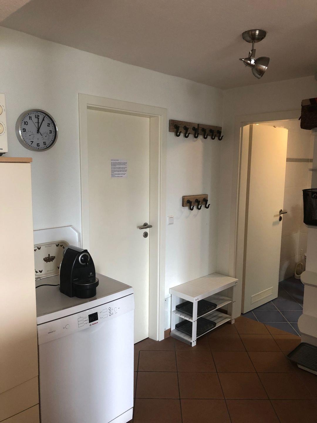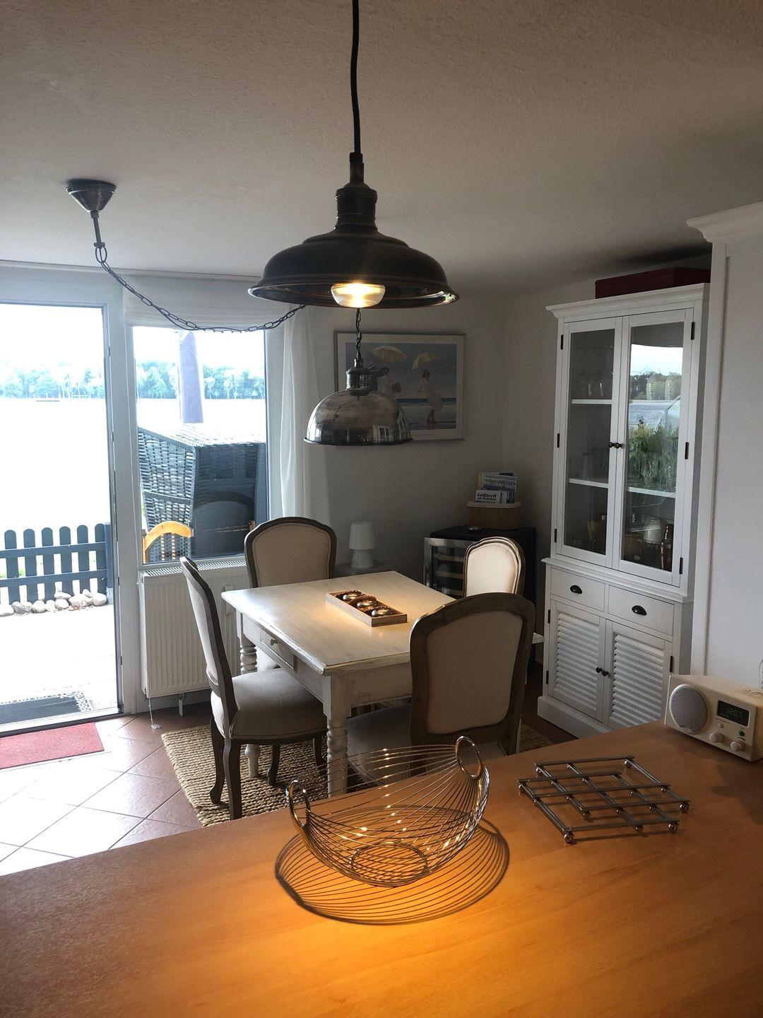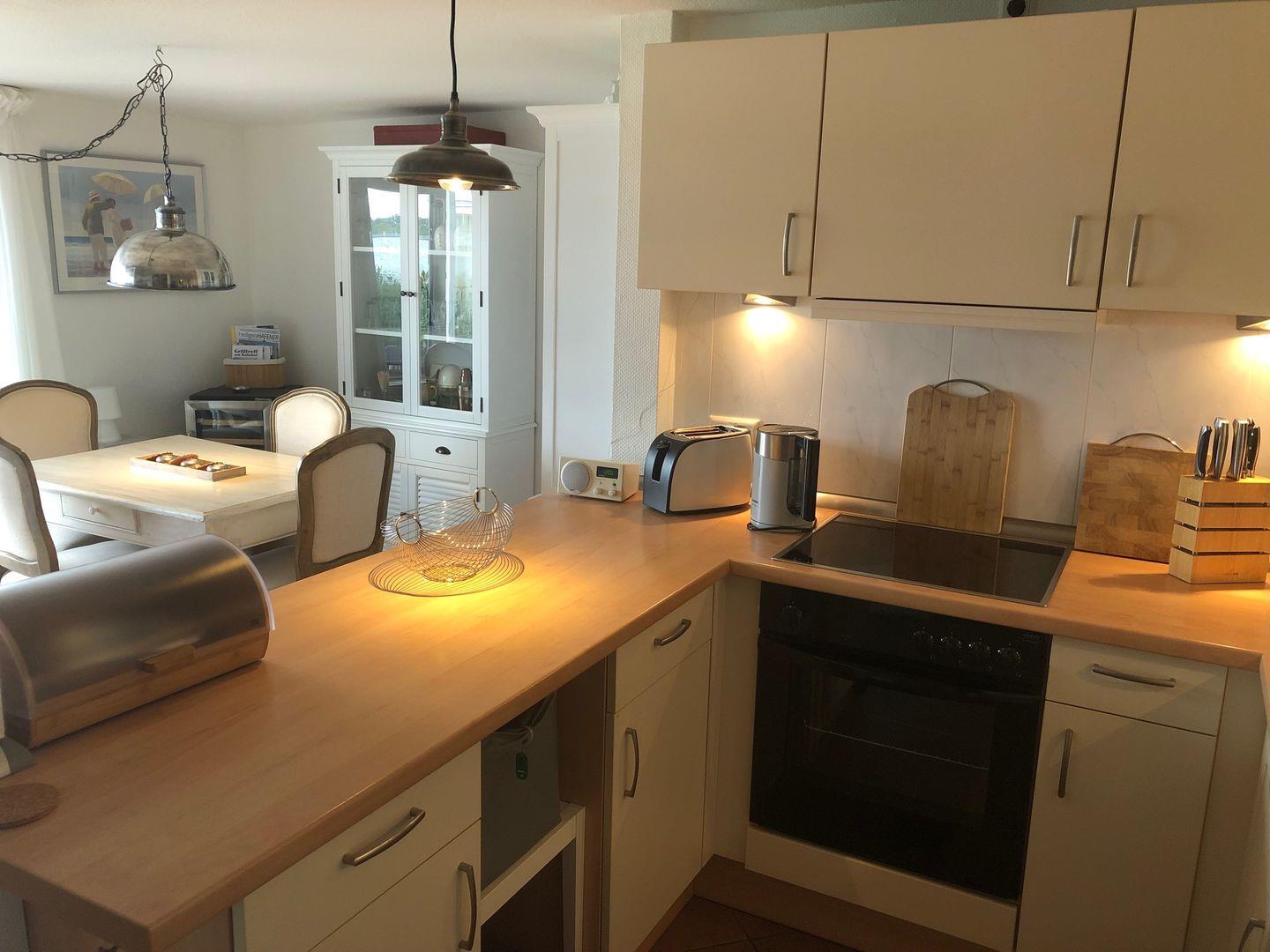 Hier werden Sie im Wohnbereich vom großen Esstisch empfangen. Die anschließende, große Einbauküche bietet viel Platz und Ausstattung zum gemeinsamen Kochen. Backofen, 4-Feld-Ceranherd, Microwelle, Geschirrspülmaschine und gängiges Zubehör unterstützen Sie bei der Zubereitung und danach.