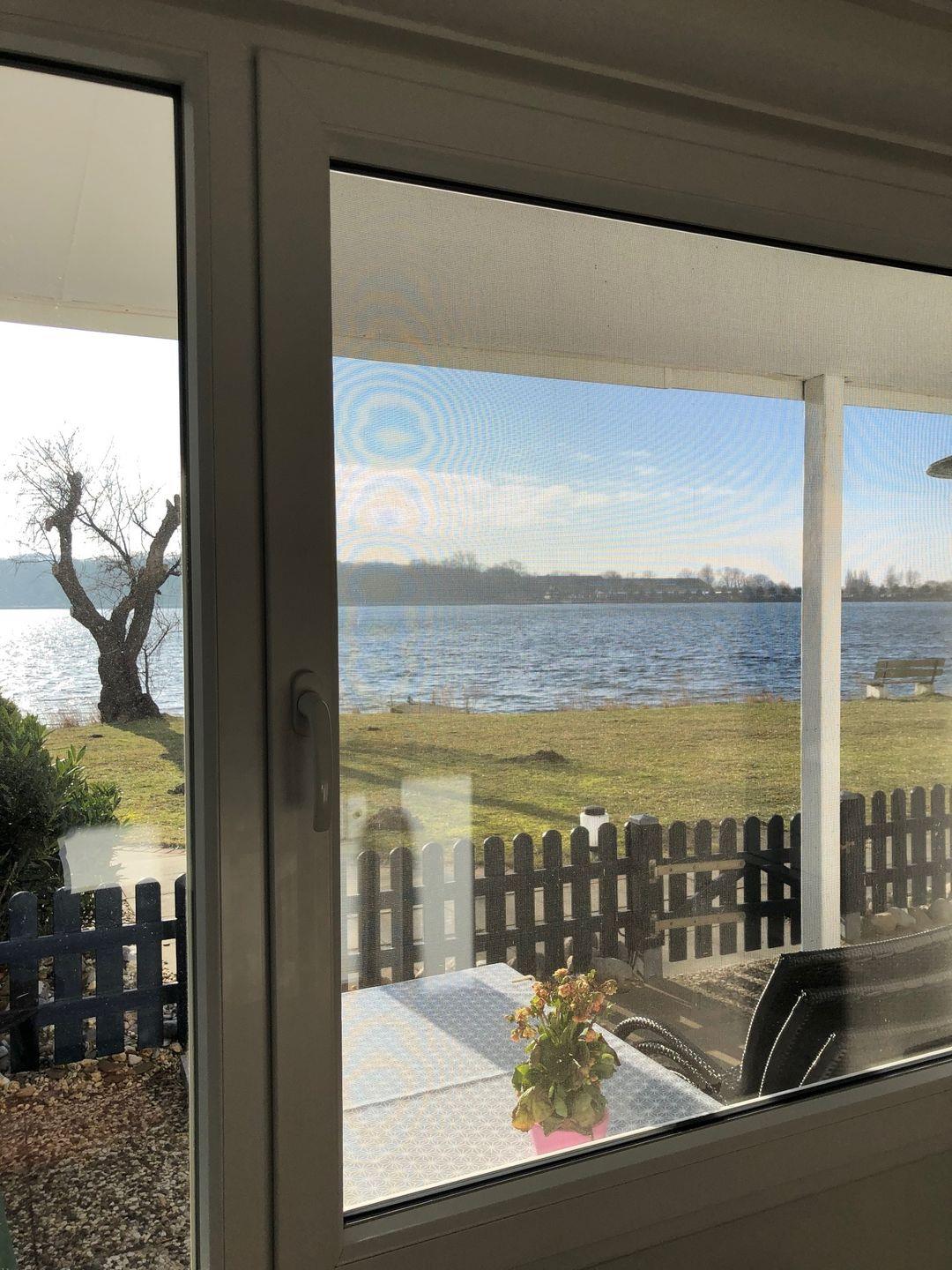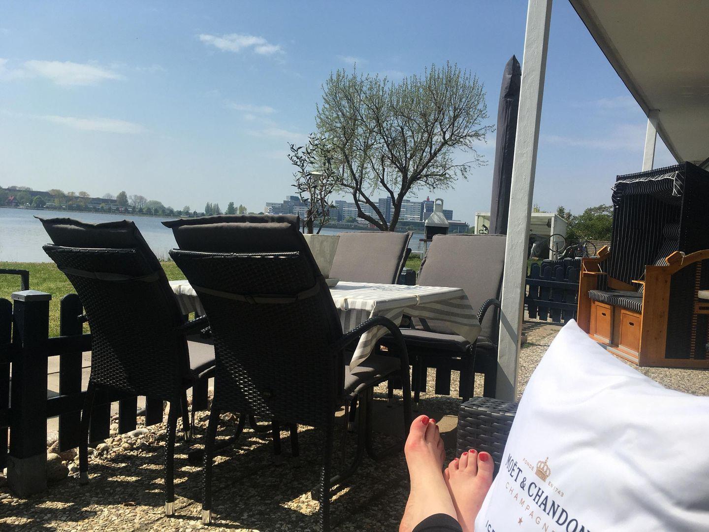 Auf der Terrasse genießen Sie den herrlichen Blick auf den See, der direkt hinter der Liegewiese mit gemeinschaftlich nutzbarem Kamingrill beginnt. Im Strandkorb sind Sie hier auch an windigen Tagen optimal geschützt. Sonnenschirm, Sonnenliegen, Tisch, Stühle und passende Auflagen komplettieren die Ausstattung.