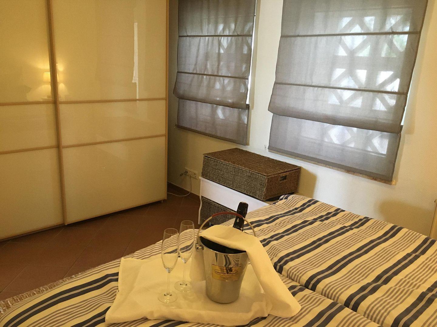 Im Schafzimmer mit Fenster finden Sie einen großen Kleiderschrank, Ganzkörperspiegel und ein großes, gemütliches Doppelbett (2*80*200 cm) vor. Ein weiteres TV-Gerät, sowie einen Safe finden Sie im Kleiderschrank.