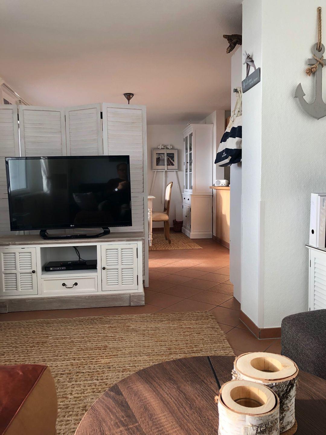 Im offenen Wohnzimmer mit Seeblick bietet eine hochwertige Eck-Couch viel Platz für kuschelige Abende. Ein großer LCD-TV, DVD-/ und BluRay-Player sowie ein Radio stehen Ihnen zur Unterhaltung zur Verfügung. Zusätzlich bietet die Wohnung ein kostenloses W-Lan-Netz.