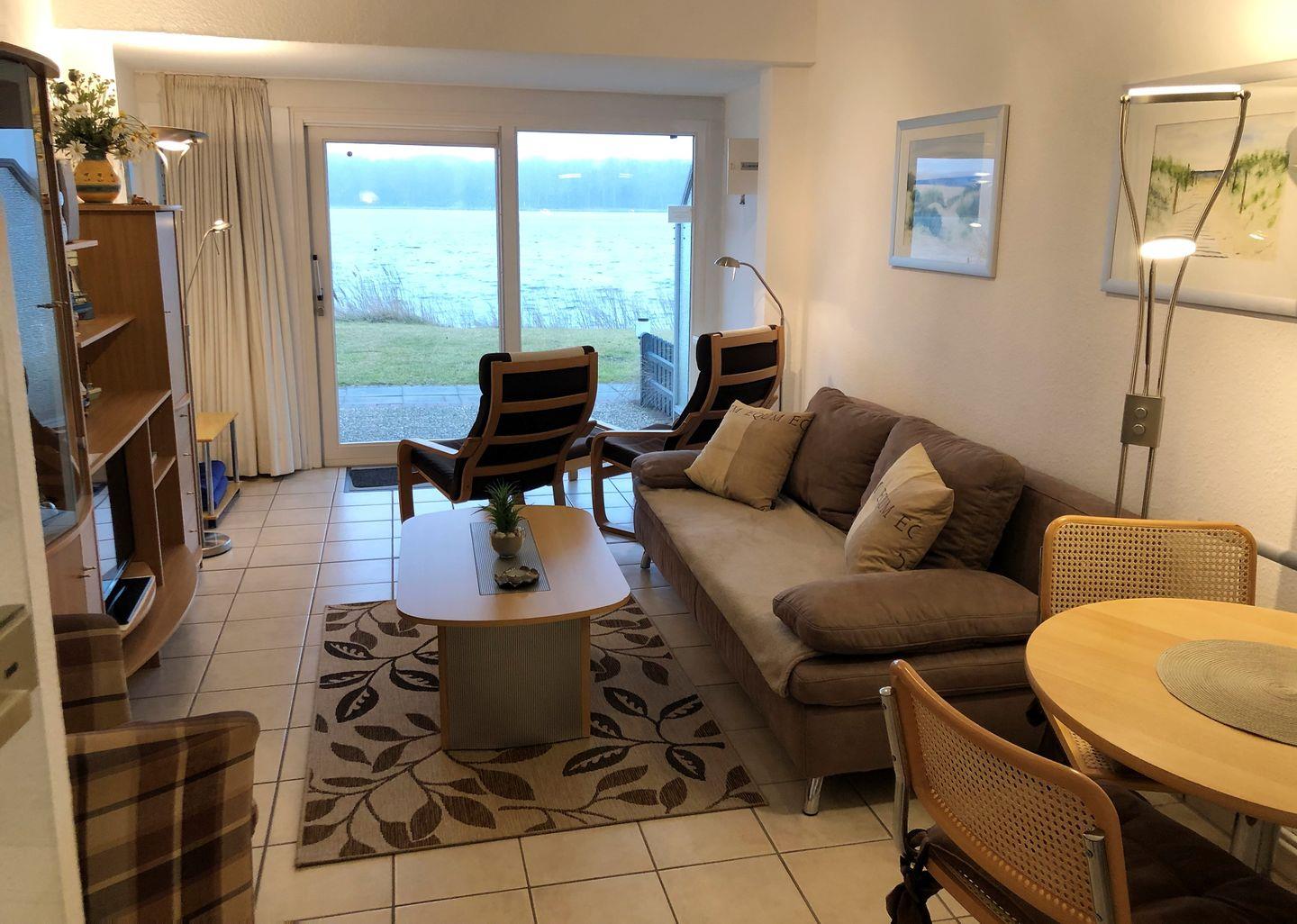 Diese exklusive Wohnung verfügt über zwei sep. Schlafzimmer mit je einem Doppelbett, sowie ein Vollbad en Suite und einem weiteren Duschbad mit WC. Die geräumige Eßdiele mit integrierter Küchenzeile lädt zu gemütlichen Mahlzeiten ein. Vom geschmackvoll eingerichteten Wohnzimmer aus, haben Sie einen traumhaften Blick auf den Binnensee und Zugang zur herrlichen Südterrasse.