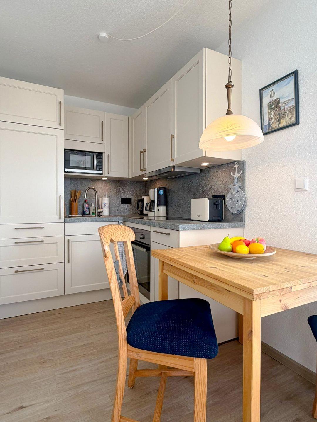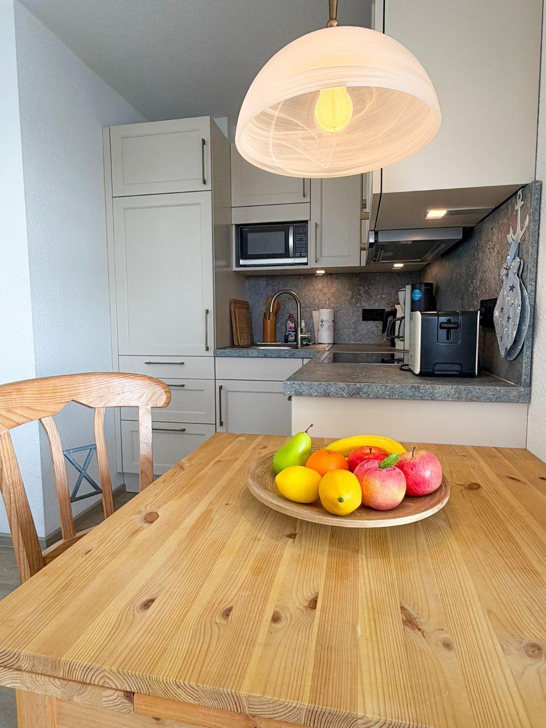 Im kombinierten Wohnraum bietet die Eck-Einbauküche umfangreiche Ausstattung zur Selbstversorgung: 4-Feld-Ceranherd, Backofen, Microwelle und Geschirrspüler sowie Ausstattung zum Kochen und Genießen am anschließenden Esstisch stehen Ihnen hier zur Verfügung.