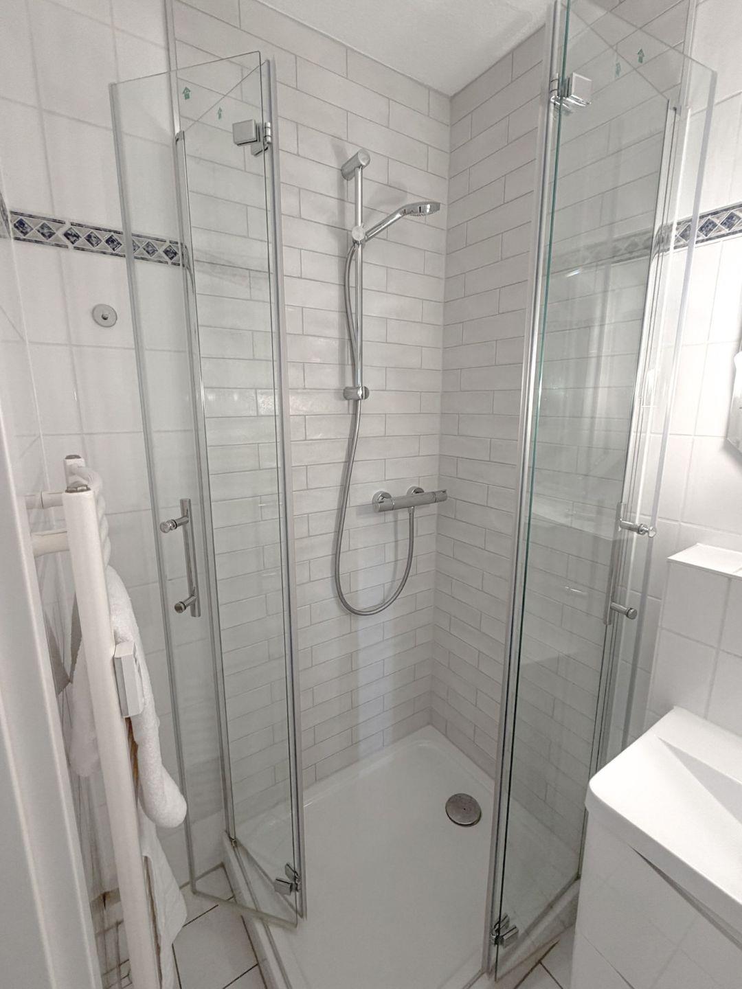Das helle, innenliegende Duschbad ist mit fester Duschkabine, Waschbecken mit beleuchtetem Spiegel, Handtuchheizkörper, WC und elektrischer Lüftung ausgestattet.