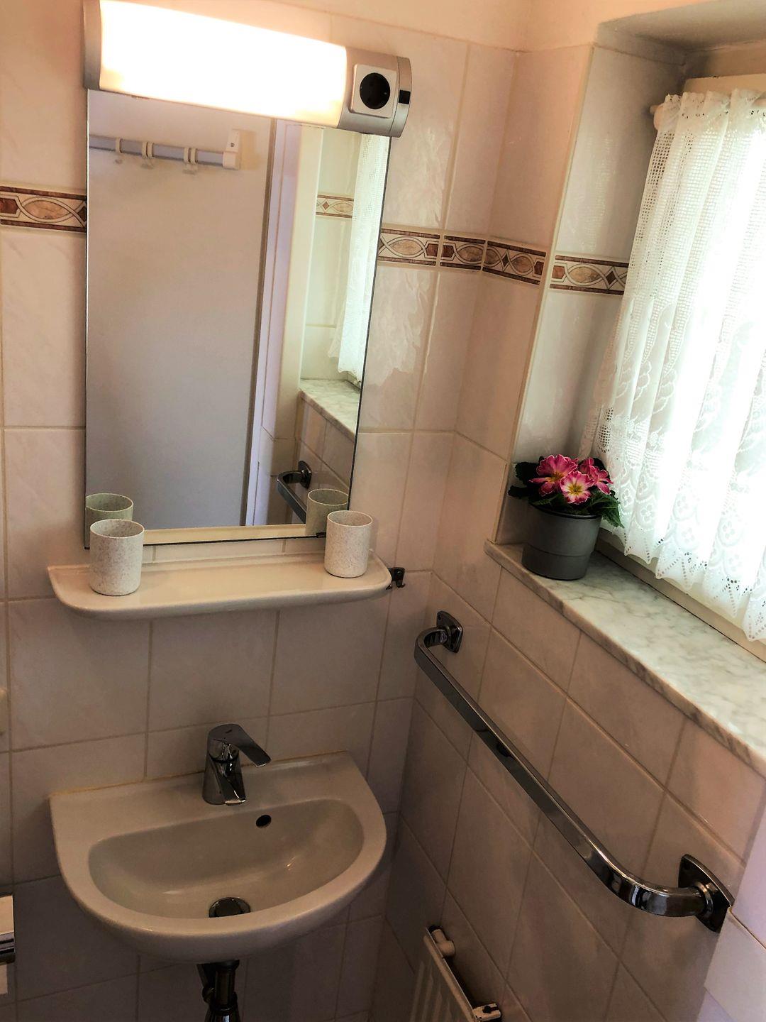 Im kleinen Tageslicht-Duschbad stehen Ihnen Waschbecken, beleuchteter Spiegel, Steckdosen, WC und Dusche zur Verfügung.