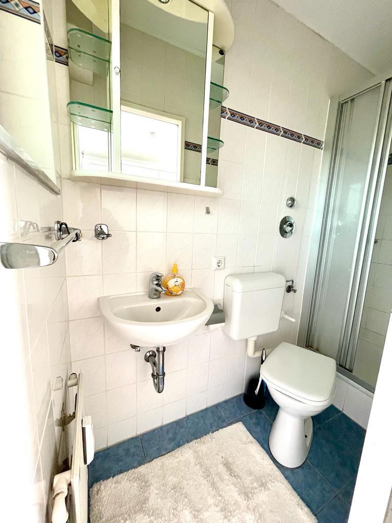 Das kleine Tageslicht-Duschbad bietet Dusche, WC, Waschbecken und einen beleuchteten Spiegelschrank.