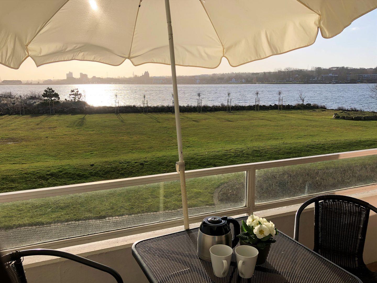 Vom asymmetrisch geschnittenen, überdachten Ost-Balkon genießen Sie den unverbauten Direktblick auf den Binnensee und die Heiligenhafener Altstadt. Hier können Sie bei einem sonnigen Frühstück herrlich in den Urlaubstag starten.
