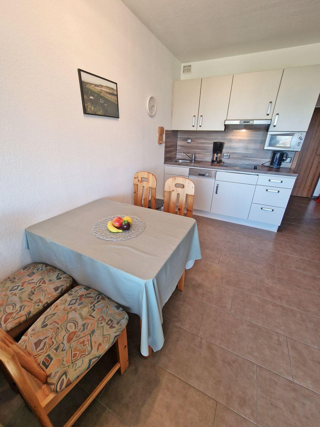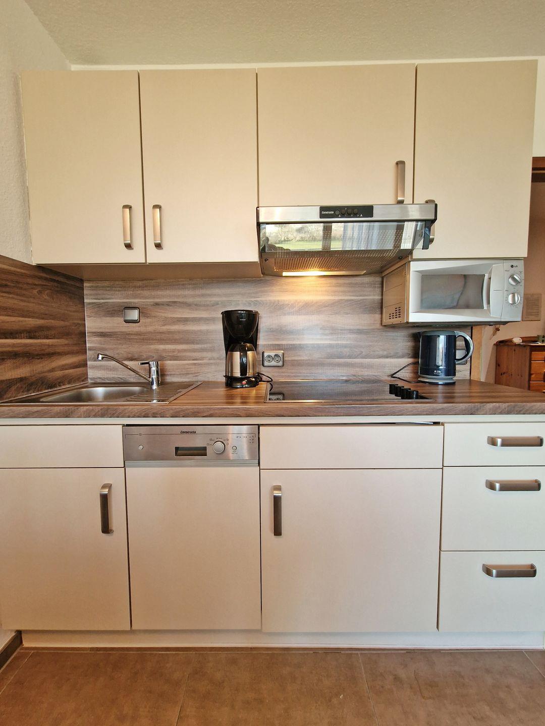 Die voll ausgestattete Küchenzeile hält einen Geschirrspüler, Kühlschrank mit Gefrierfach, Microwelle und 4-Feld-Ceranherd sowie die gängige Ausstattung für die Zubereitung Ihrer Urlaubsmenüs bereit.