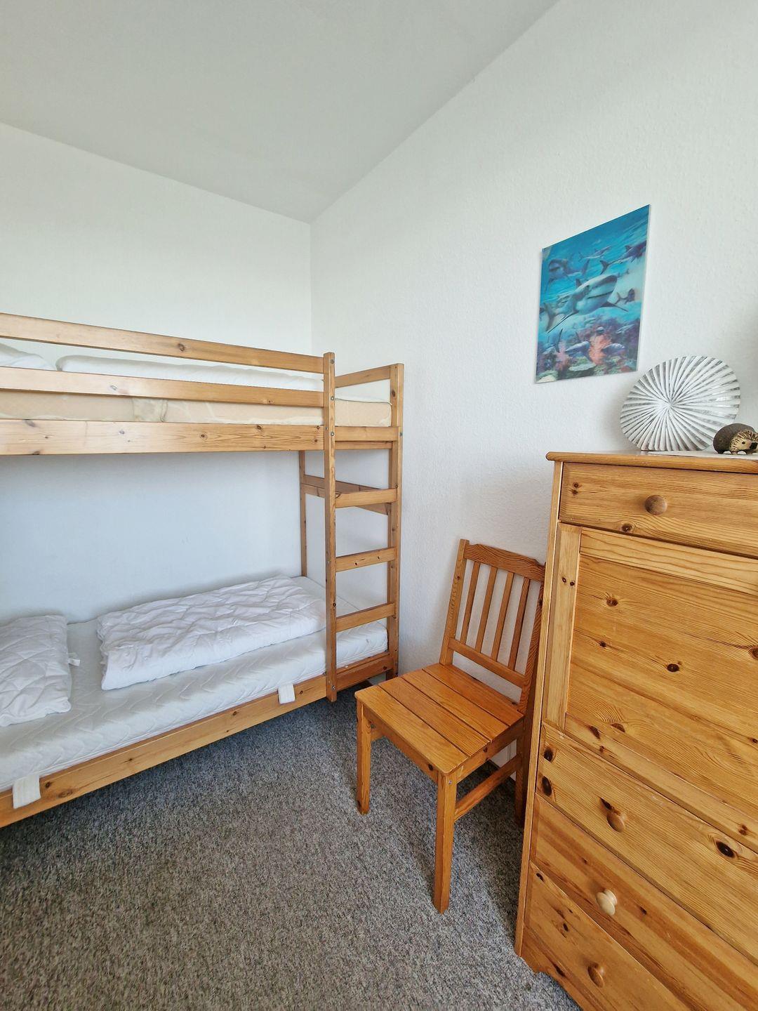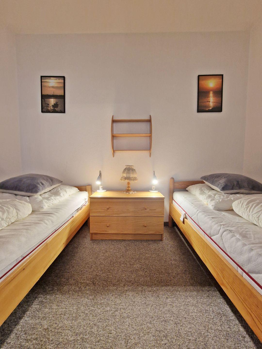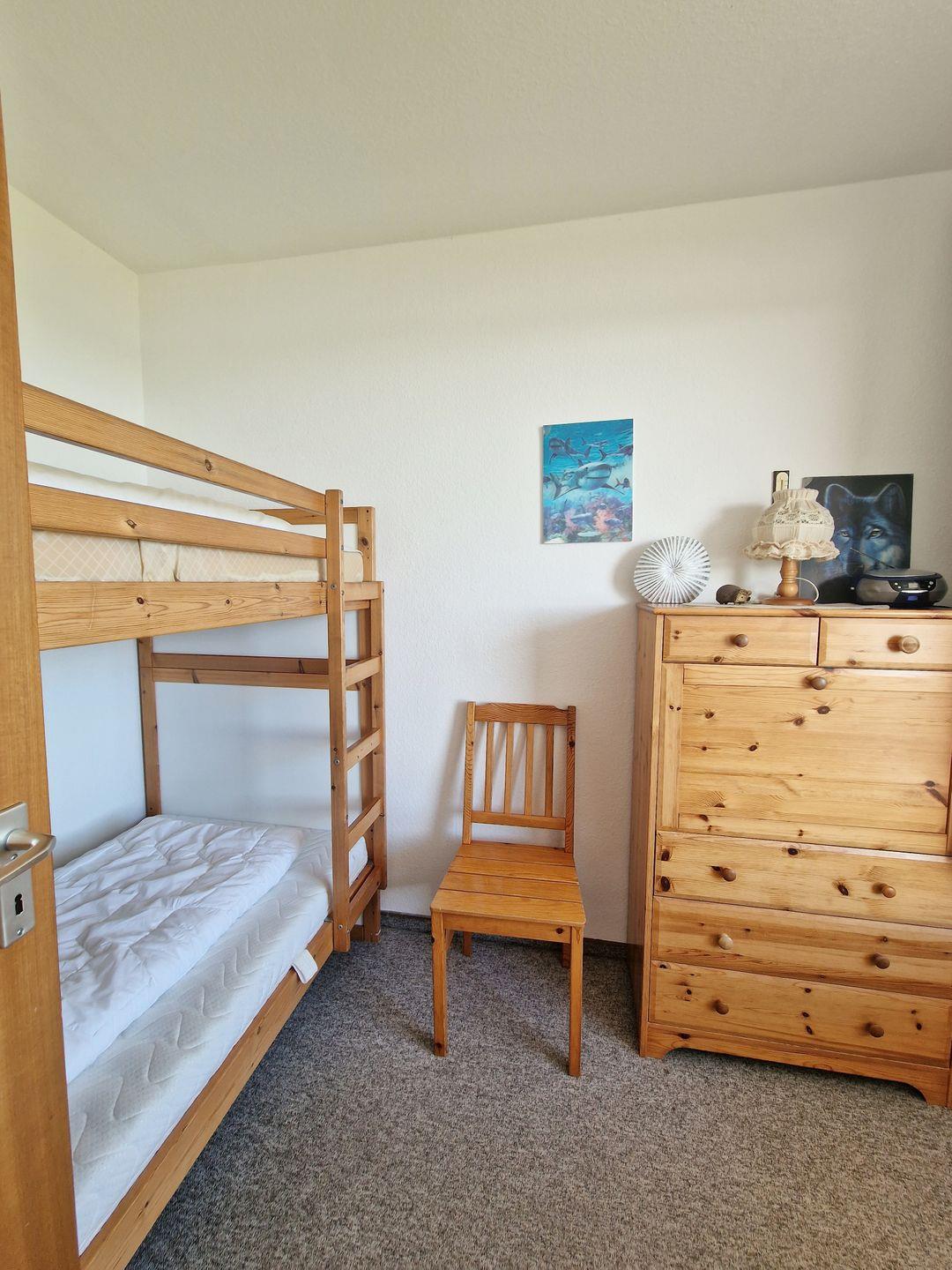 Im weiteren Schlafzimmer findet sich ein Etagenbett (je 90*180 cm), ein Wäscheschrank und ein Fenster zum Balkon, welches durch Vorhänge abgedunkelt werden kann. Beide Schlafzimmer sind mit Teppich ausgelegt.