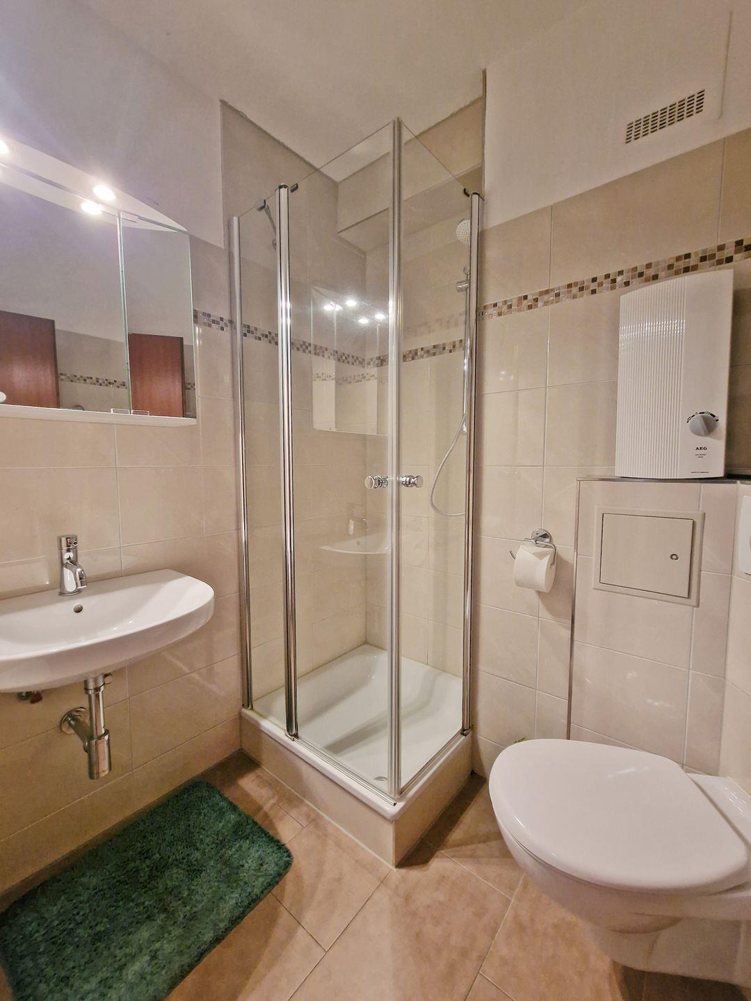 Von hier gelangen Sie in das moderne, innenliegende Duschbad mit fester Duschwand, beleuchtetem Spiegelschrank, Steckdosen, Hänge-WC und Heizlüfter.