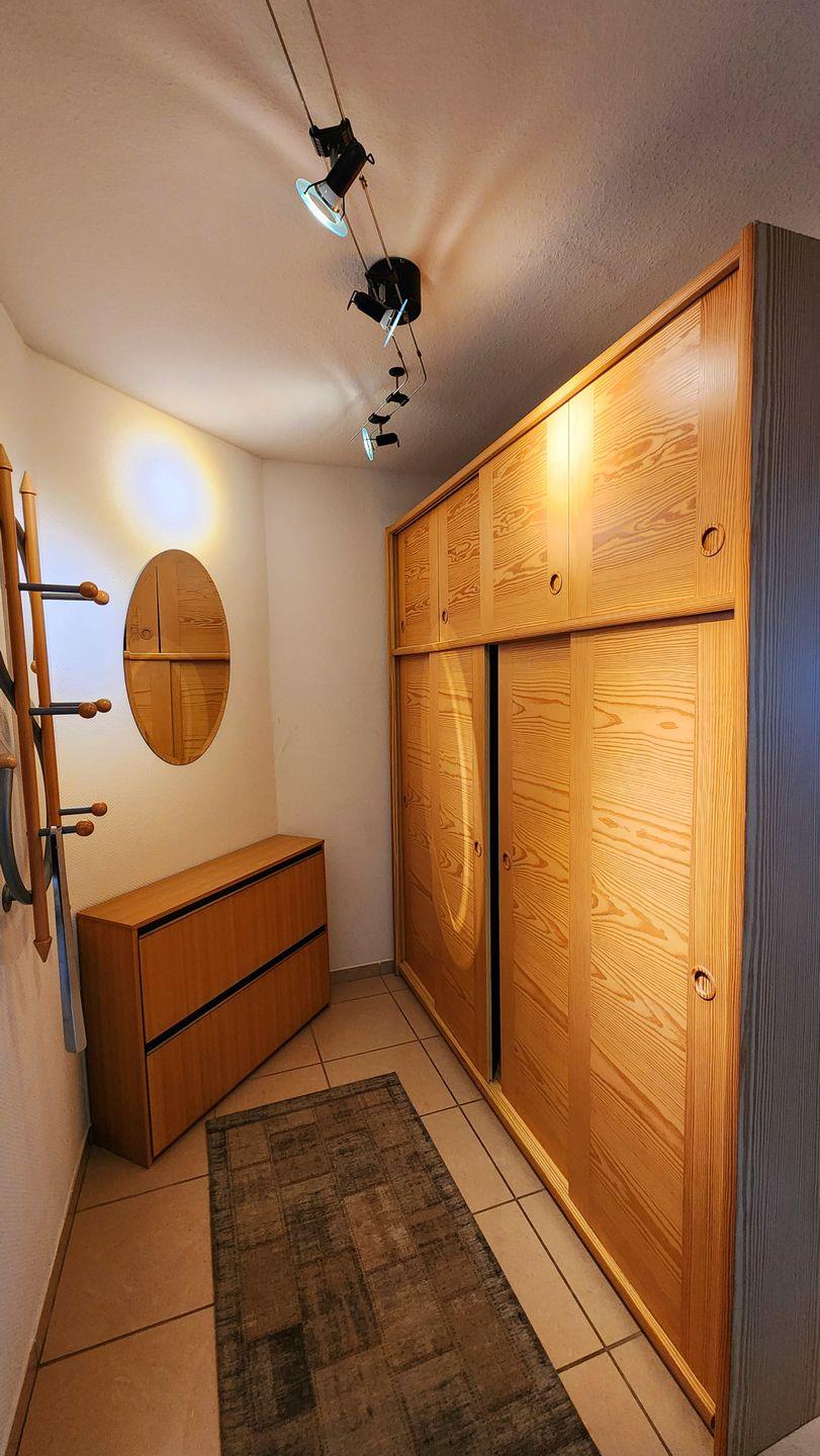 Im Eingangsbereich steht Ihnen ein großer Kleiderschrank, Schuhschrank und Garderobe zur Verfügung. Von hier geht auch das innenliegende Duschbad mit elektrischer Lüftung, beleuchtetem Spiegelschrank, Steckdose, Dusche mit fester Duschwand und Heizlüfter ab.