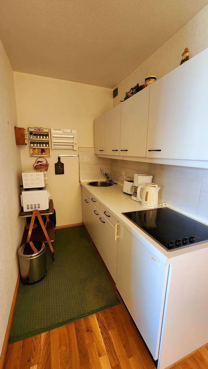 Die zum Wohnzimmer offene, zweckmäßige Küchenzeile bietet ein 4-Feld-Ceranhherd, eine Microwelle, Kühlschrank mit Gefrierfach und alle übliche Ausstattung.