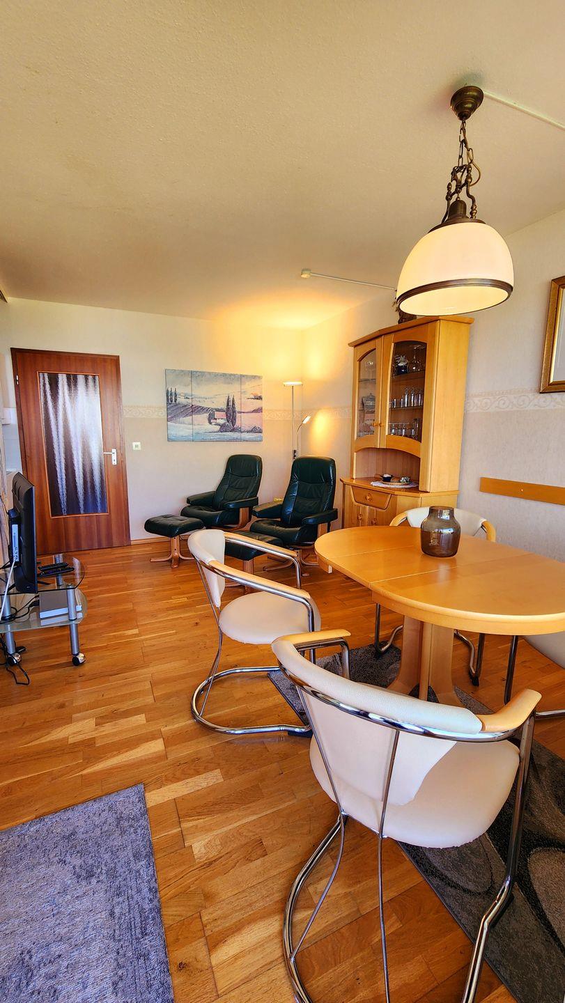 Weiter kommen Sie vom Flur in das Wohnzimmer: Hier warten zwei gemütliche Ledersessel mit Hockern, ein Esstisch mit Platz für 4 Personen, ein LCD-TV (26 Zoll), DVD-Player und Radio/CD-Player auf Sie.