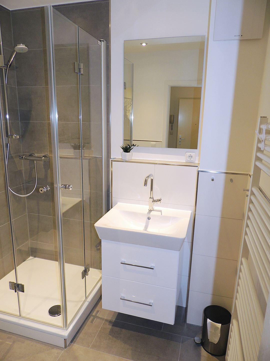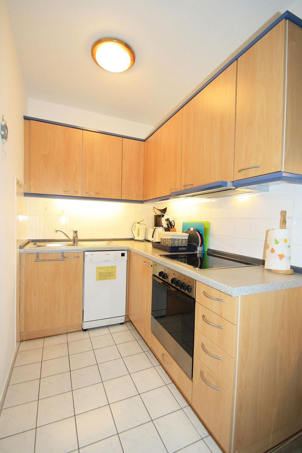 Im hinteren Teil des Wohnbereiches befindet sich das Ehebett. Die Couchgarnitur besteht aus einer modernen grau und schwarzen sehr gemütlichen 3-Sitzer-Struktureckcouch. Vom großzügigen Essplatz (mit 4 zeitgemäßen und bequemen Stühlen und Holztisch) aus, der sich am Fenster befindet schweift der Blick träumerisch zum Binnensee. Das Kinderzimmer ist mit einem Einzelbett, großem Kleiderschrank und zusätzlicher (Schlaf)-Couch (mit Matratze- sehr bequem) ausgestattet. Die moderne und helle Küchenzeile in L-Form -technisch mit 4-Platten-Ceranfeld, Backofen und Geschirrspüler ausgestattet- lädt den Hobbykoch zum schnellen Snack oder einem größeren Menü ein. Das helle Duschbad mit Kabine und Hänge-WC ist komplett gefliest. Ein großer 40 Zoll LCD-TV samt DVD und Stereo-CD-Radio sorgt für Kurzweile.