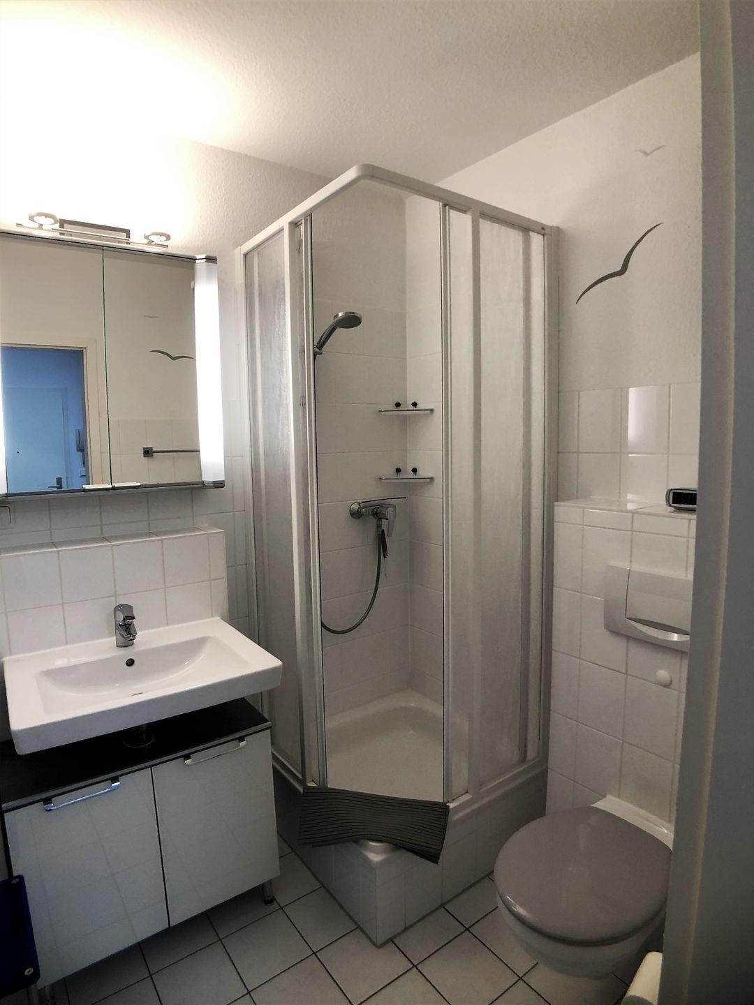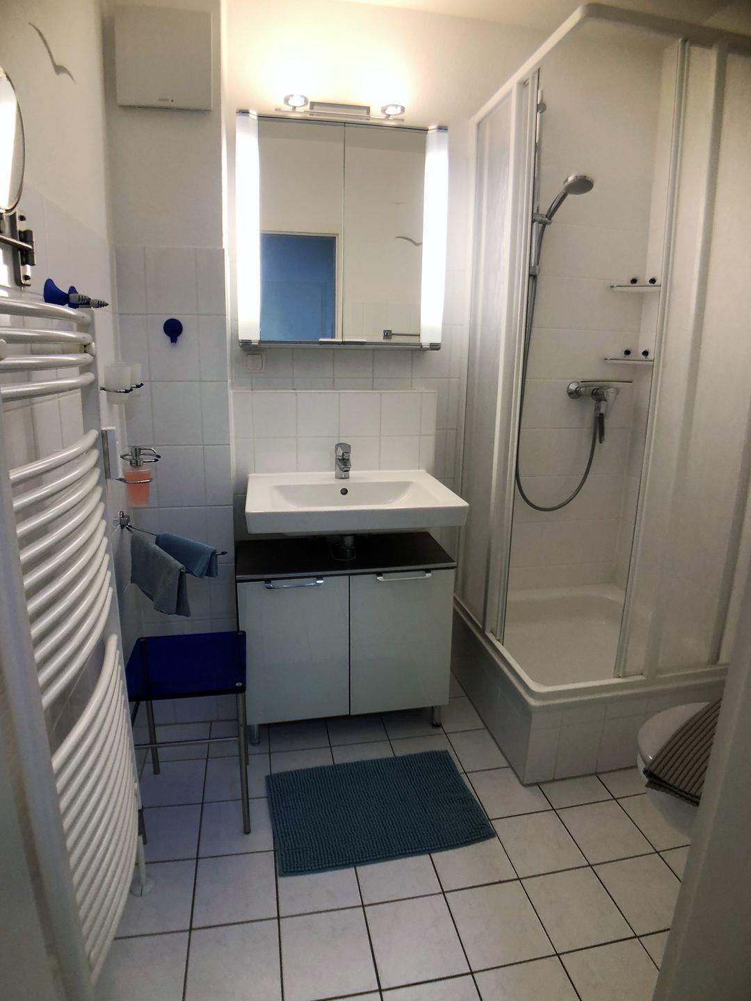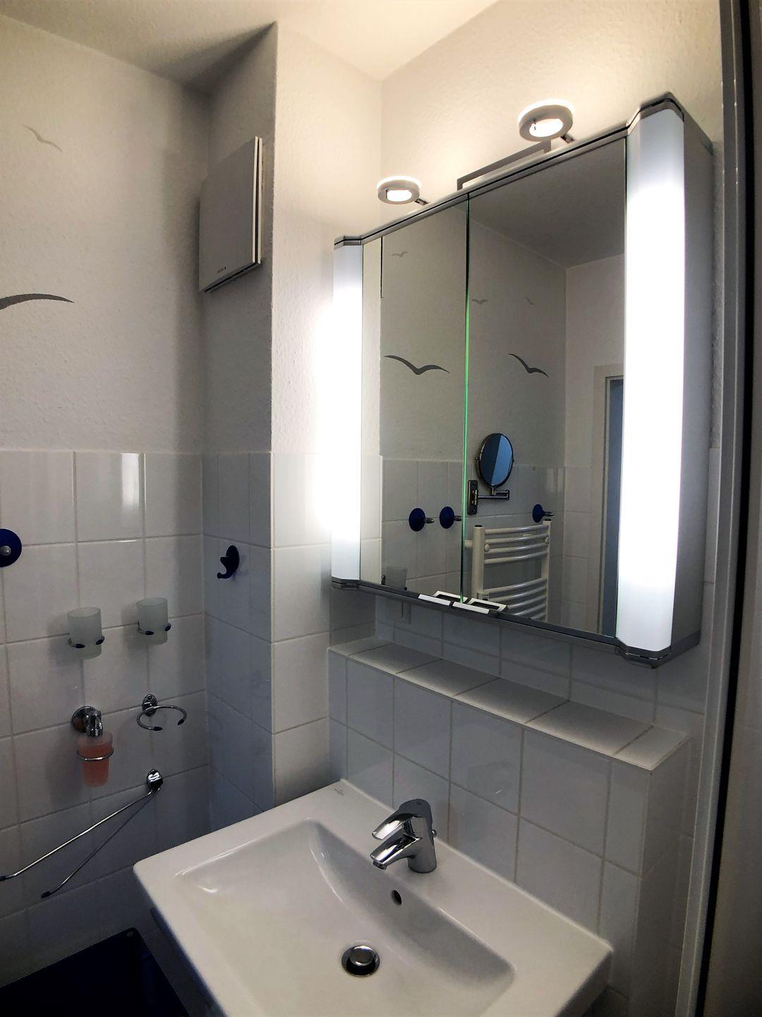 Anschließend erwarten Sie im innenliegenden Duschbad ein beleuchteter Spiegelschrank, Waschbecken mit Unterschrank, elektrische Lüftung, Handtuchheizkörper, Kosmetikspiegel, Steckdose, Dusche mit fester Duschwand und wandmontiertes WC.